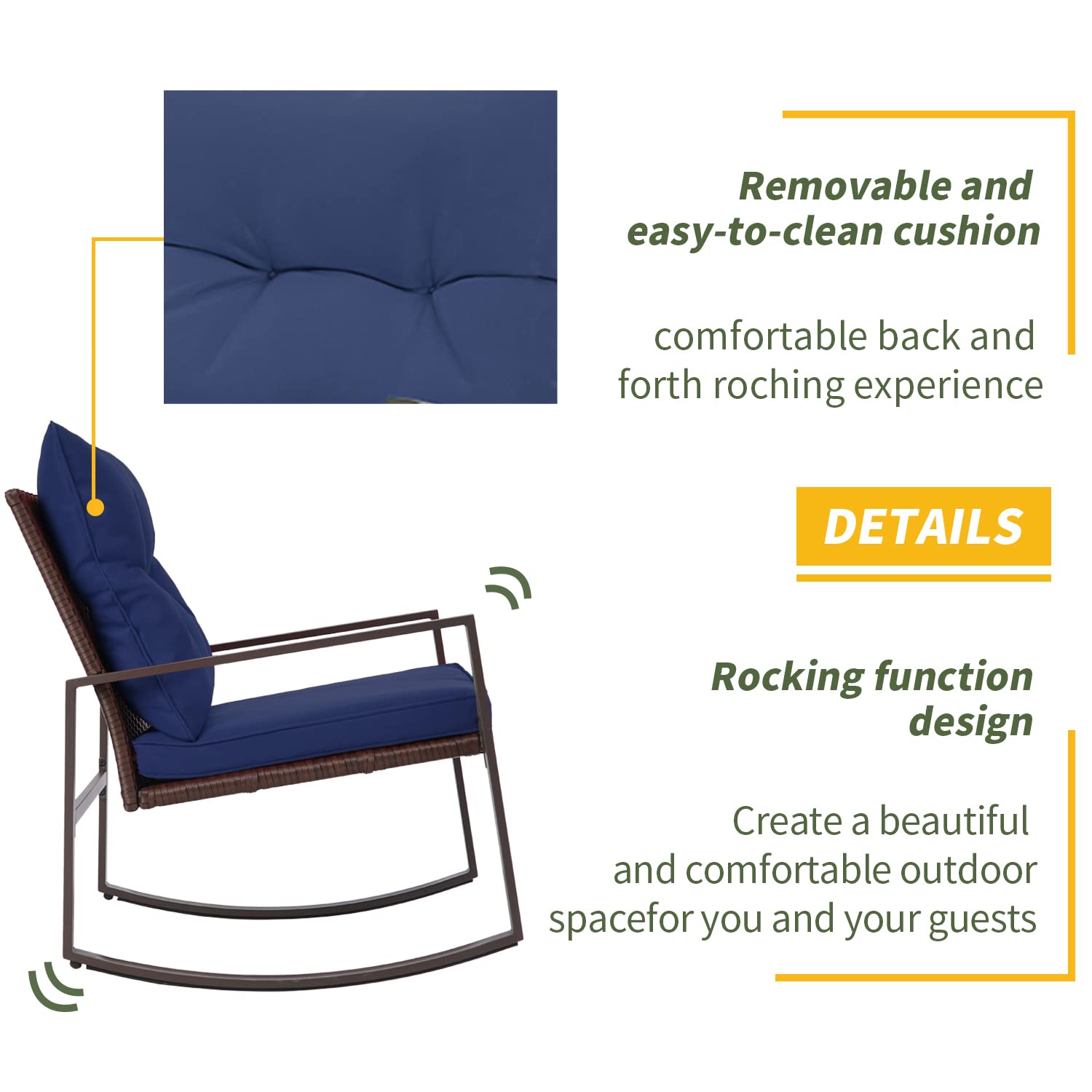 - Exquisite Comfort Rocking Design Our patio rocking chairs set are specifically designed to make better use of a variety of outdoor spaces. The rocking chair has adjustable screws at the bottom of the chair legs allow you to easily adjust the comfortable swing range, and the suitable rocking range bring you dreamy rocking feeling