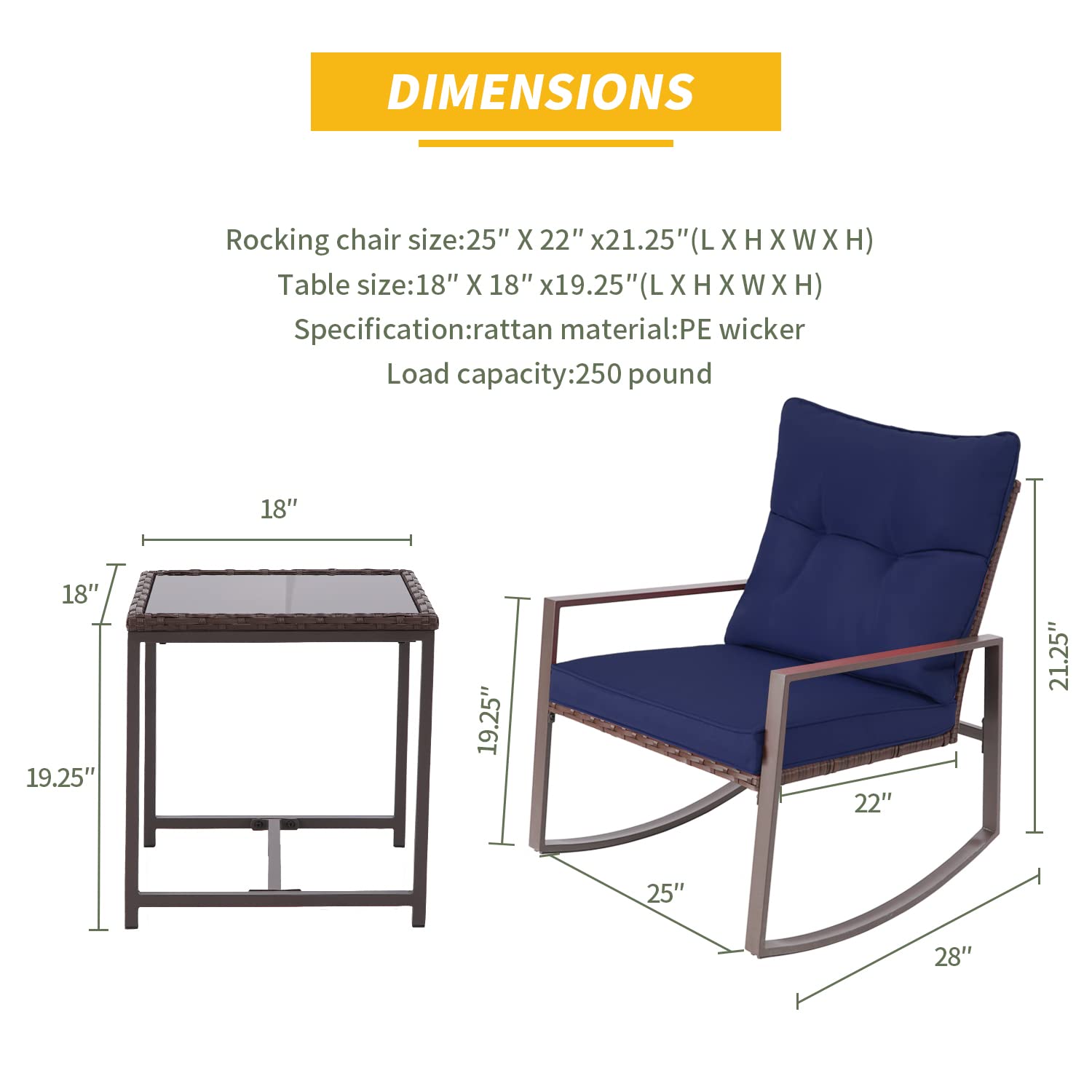 - Spacious Chairs Design Our outdoor 3 piece rocking bistro set are quite roomy, provide enough room to seat comfortably and the legs that connected and arm resets are designed to provide additional support and balance as you shake the chair