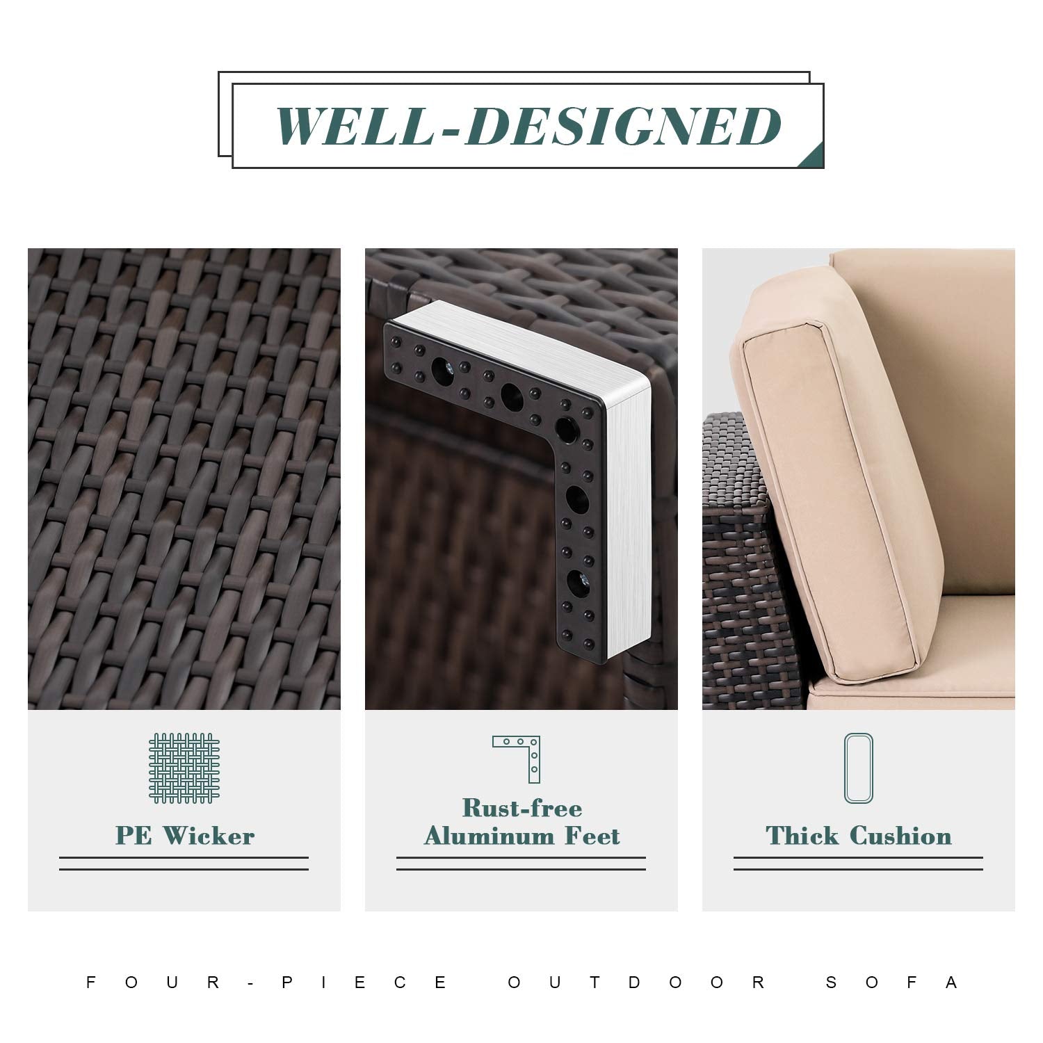 - LARGE SIZE DESIGN - This 4-piece modern outdoor sectional sofa adopts a large size design, and the seating space is larger than the general 7-piece sofa set, which can easily seat 4-6 friends comfortably. The thickly padded seat cushion provides upgraded comfort.