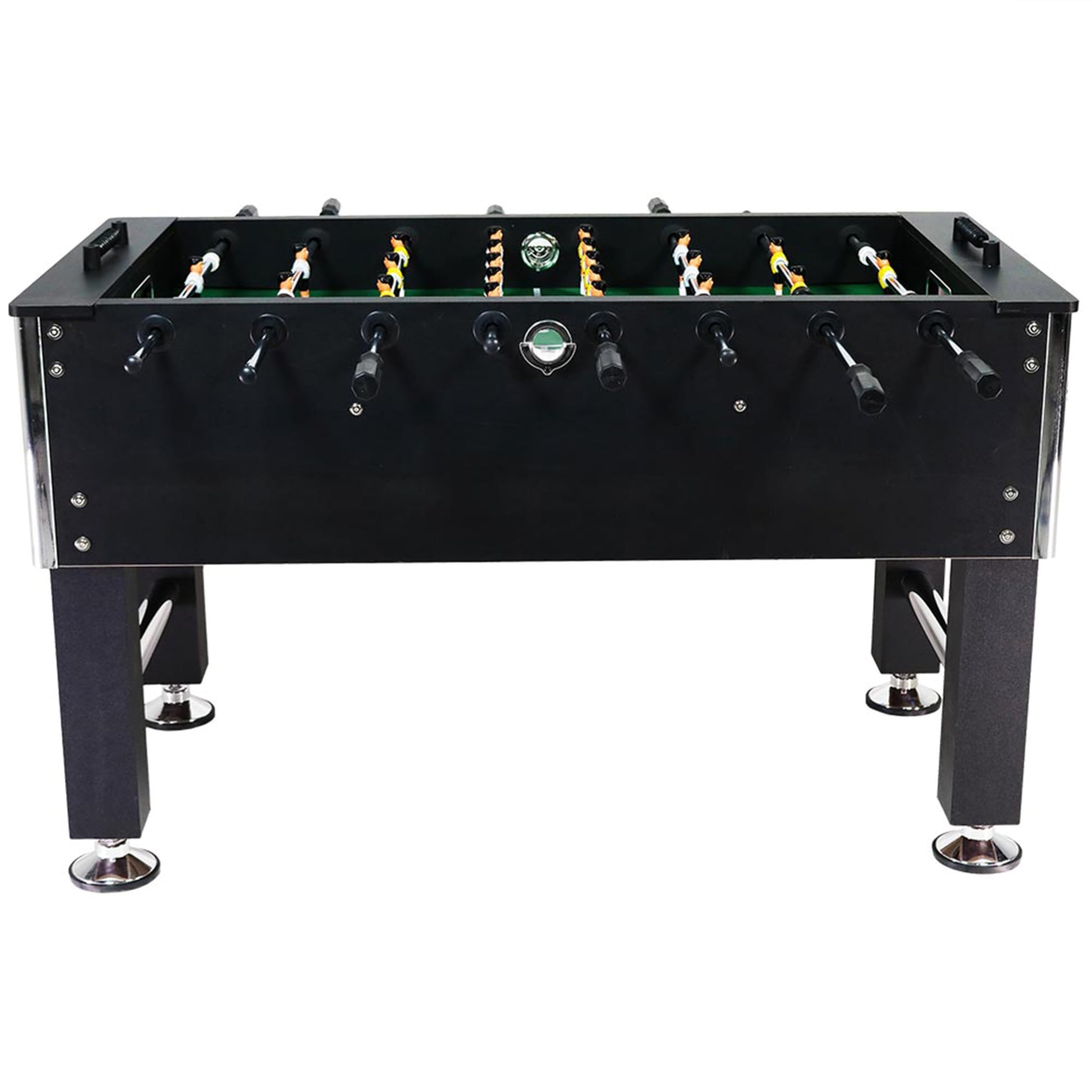- HIGH PERFORMANCE: This full-size foosball table is black with chrome accents so it is sure to blend in with any contemporary setting. Plus, ball bearings allow rods to spin easily, and the rubber grips make them easy to grip. The corners are raised to ensure that the ball won't get stuck during an intense game.