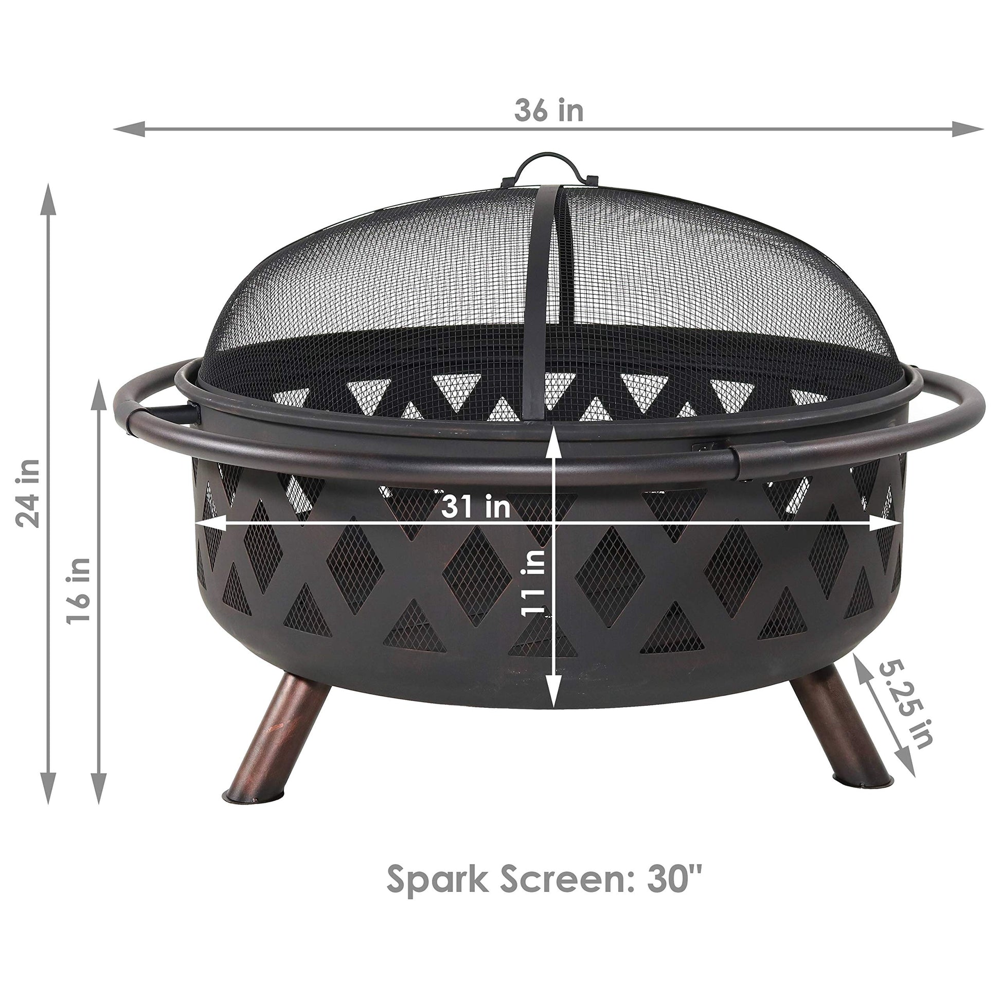 - Great for large gatherings: This large fire pit is ideal for gathering friends and family for a bonfire in the yard or on the patio. This fire pit measures 36" in diameter x 24" H overall. The fire bowl measures 31" in diameter x 11" H. This crossweave fire pit is 16" H without the spark screen and weighs 29 lbs.