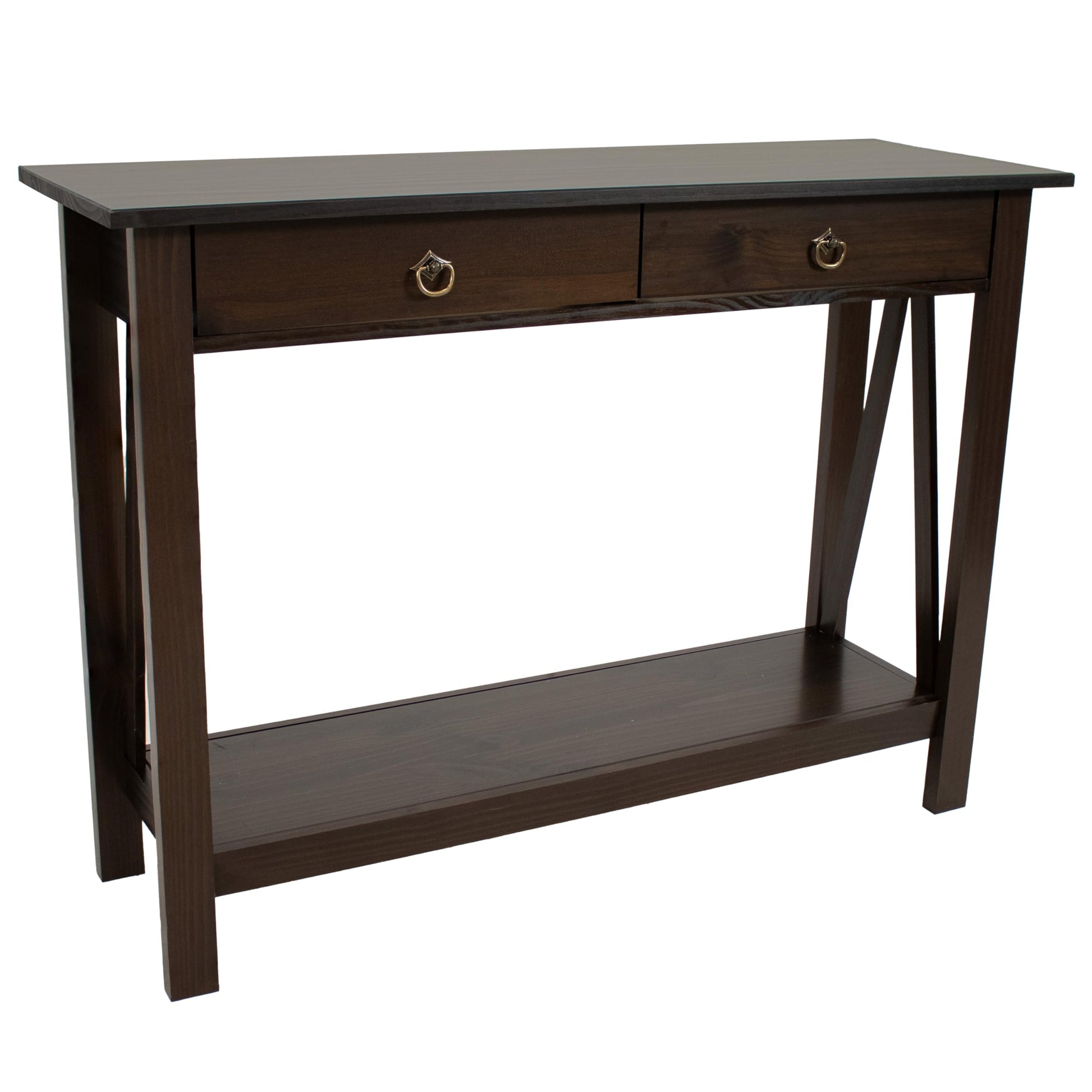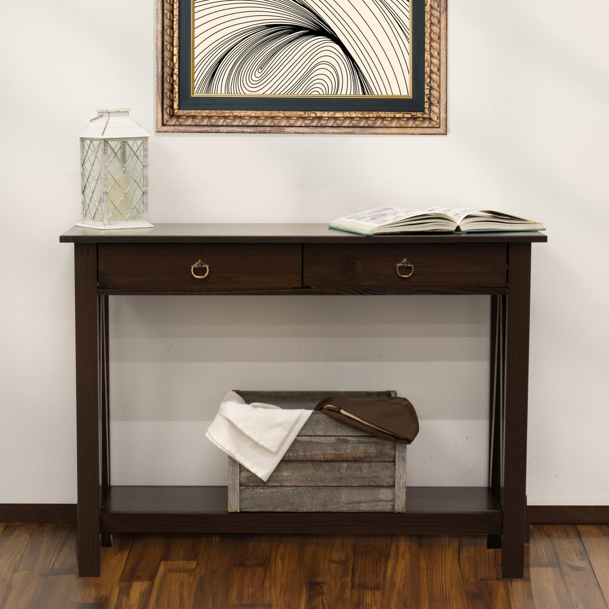 - QUALITY CONSTRUCTION: This entryway table with drawers is designed to withstand everyday use and maintain its aesthetic appeal. It is made from solid pine wood and is finished with a dark brown stain for a classic look.