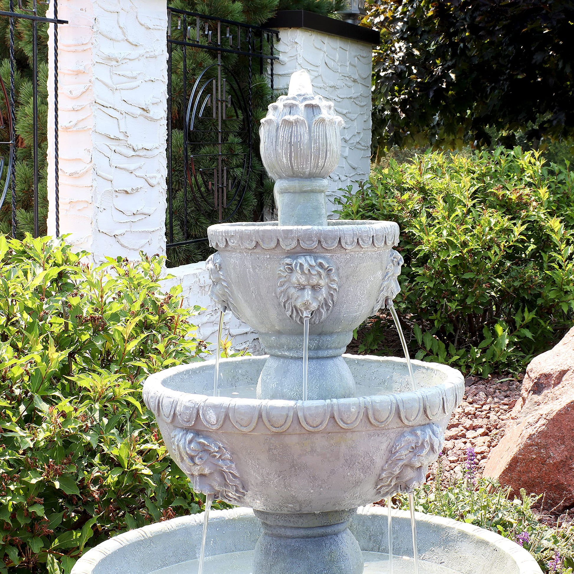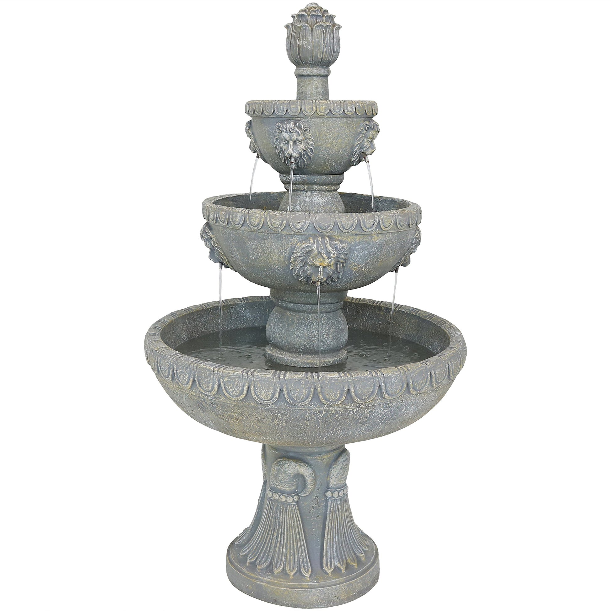 - RELAXING WATER SOUNDS: Unwind and enjoy the soothing sounds the waterfall garden fountain creates as water cascades out of each lion head on each tier and circulates back up the electric submersible pump.