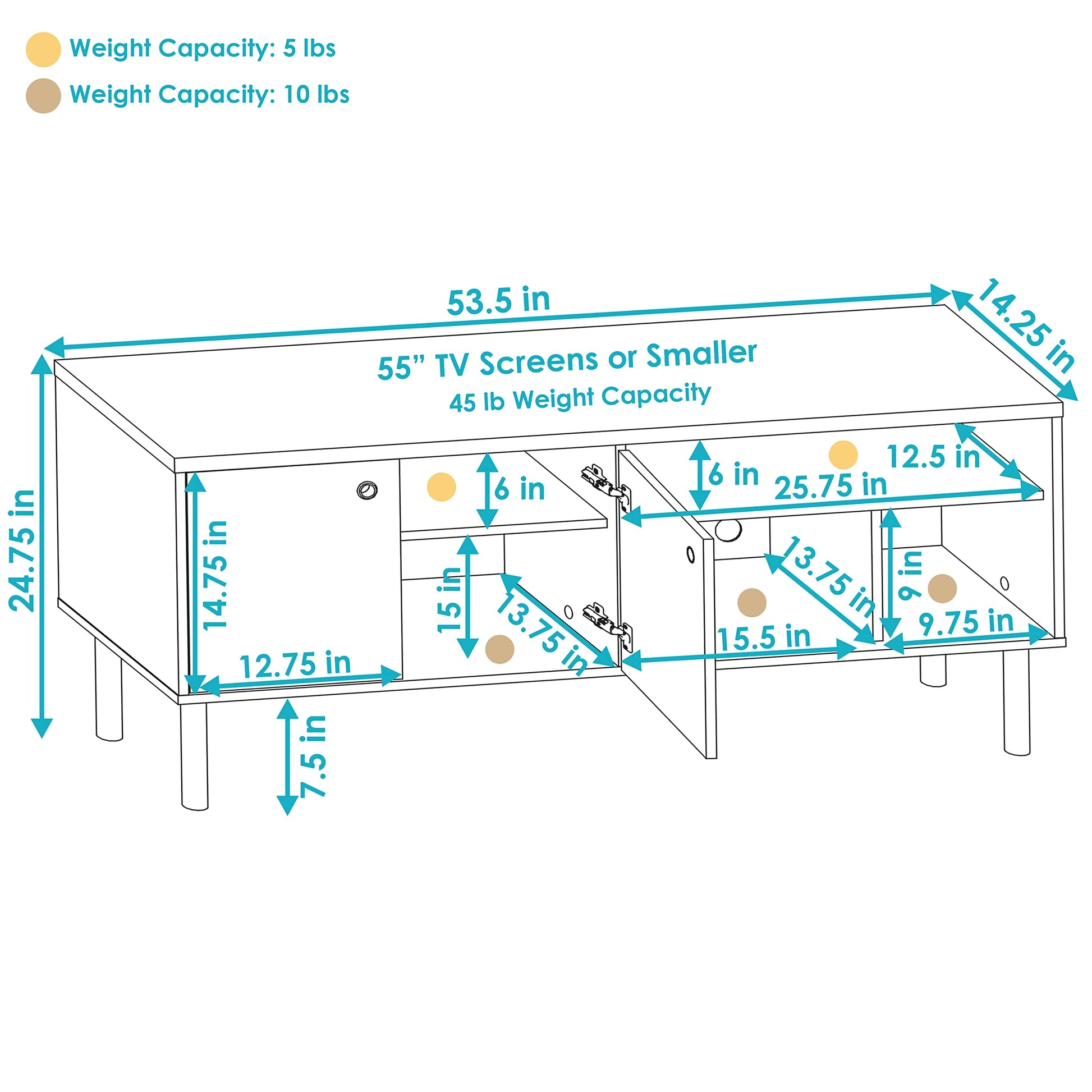 - For 55” TV or smaller: The storage TV stand measures 53.5" W x 14.25" D x 24.75" H overall and weighs 58.6 lbs. The top shelf is 25.75" W x 12.5" D x 6" H and holds up to 5 lbs. The largest lower shelf is 15.5" W x 13.75" D x 9" H. The smallest lower shelf is 9.75" W x 13.75" D x 9" H. Each lower shelf holds 10 lbs. The bottom cabinet shelf measures 25.75" W x 13.75" D 15" H. The top cabinet shelf measures 25.75" W x 12.5" D x 6" H. The cabinet doors are 12.75" W x 14.75" H x 0.5" thick each.