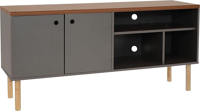 - Mid-century modern design: Add a classic touch to your living room or den with this retro TV stand. The media console cabinet is made from medium-density particleboard (MDP) with eucalyptus wood legs and aluminum hardware.