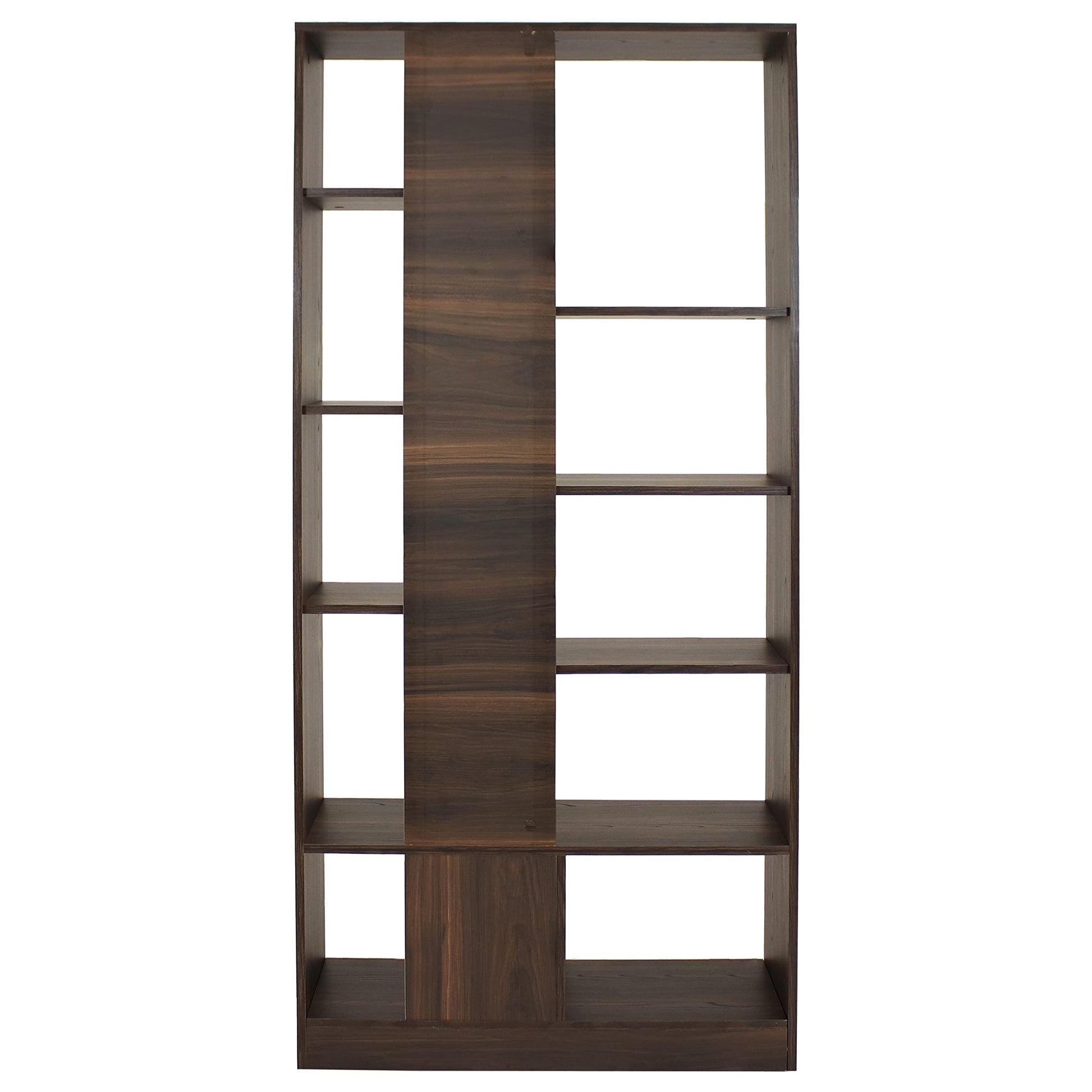- MODERN DESIGN: This staggered bookshelf features a coffee brown finish and an open back that contrasts your indoor living space. The display shelf is made from pine and eucalyptus thermofused MDF with polypropylene feet.