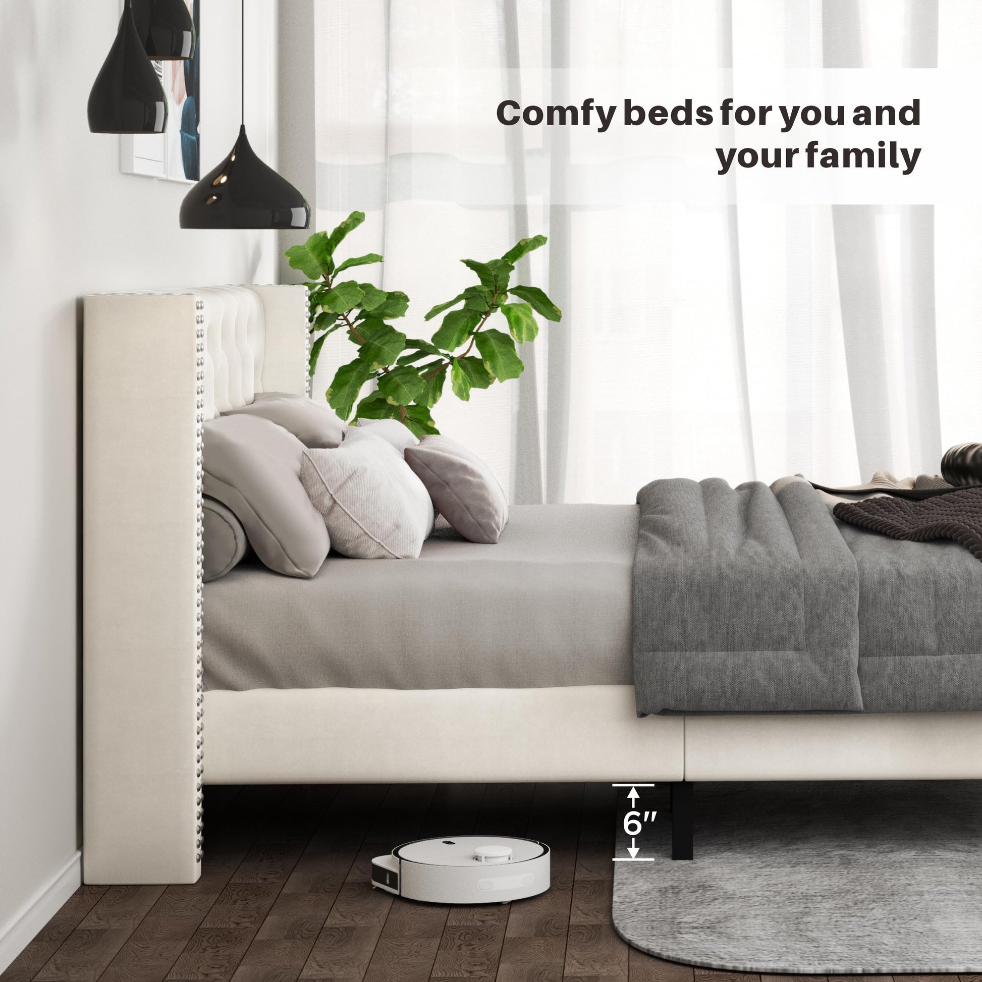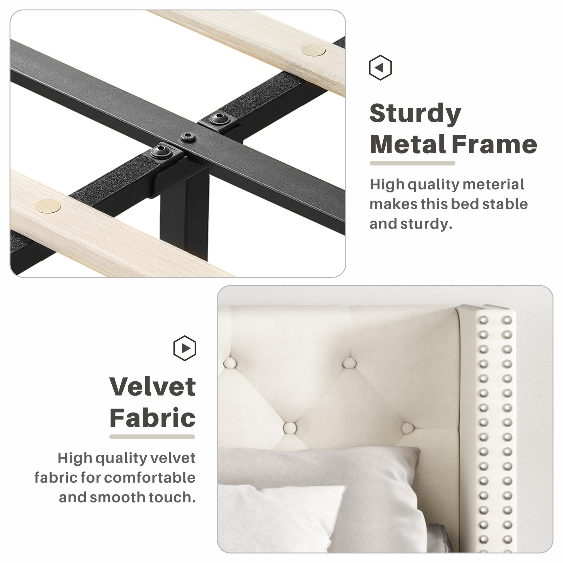Full Size Bed Frame with Wingback Headboard Upholstered Platform Beds Beige Velvet