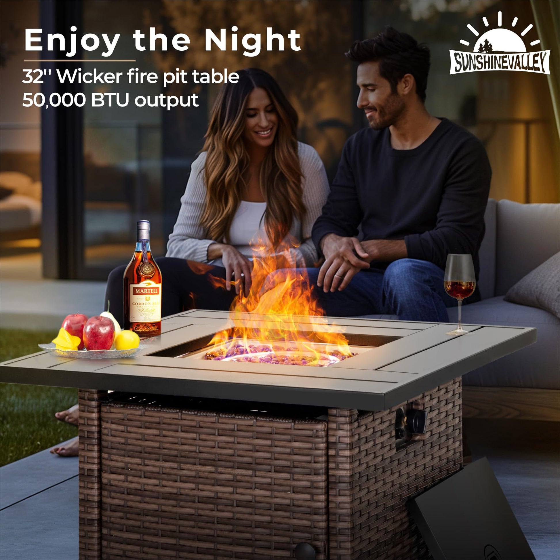 - VERSATILE OTTOMAN & 50000 BTU FIREPIT TABLE The functional ottomans can be used as a single seat, coffee table, or just ottoman, making it always a good choice for family, friends, party, or just your own alone time. 50000 BTU firepit table provides light and warmth for the night (11 lbs blue fire glass included).If you meet any problems, please contact us at any time, and we will try our best to help.
