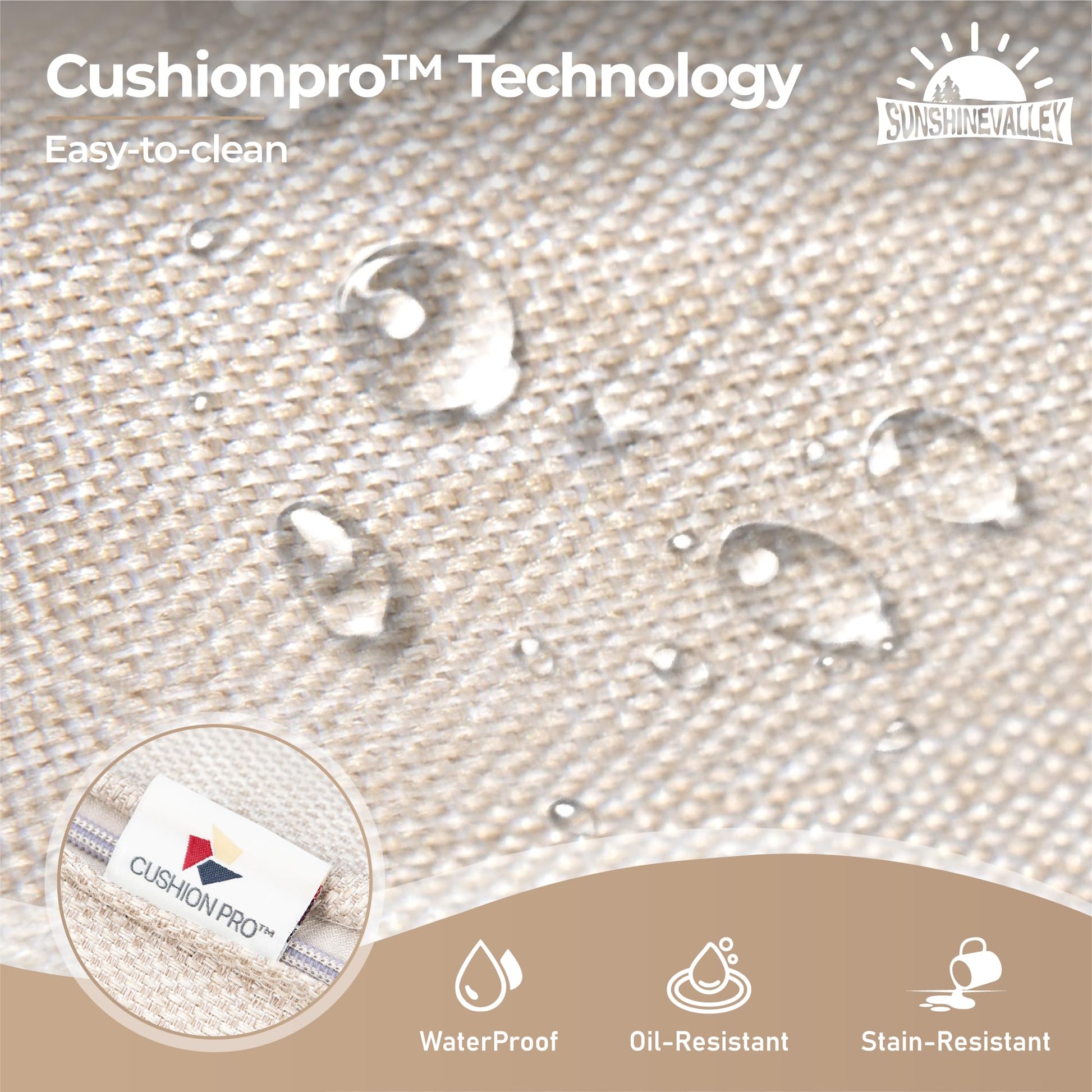 - CUSHION PRO TECHNOLOGY - EASY TO CLEAN The fabric of this conversation set is applied with CUSHION PRO TECHNOLOGY. It's waterproof, oil-resistant, and stain-resistant, making the fabric so easy to clean, you can easily wipe off the water, wine, oil, and bird droppings with a rag.