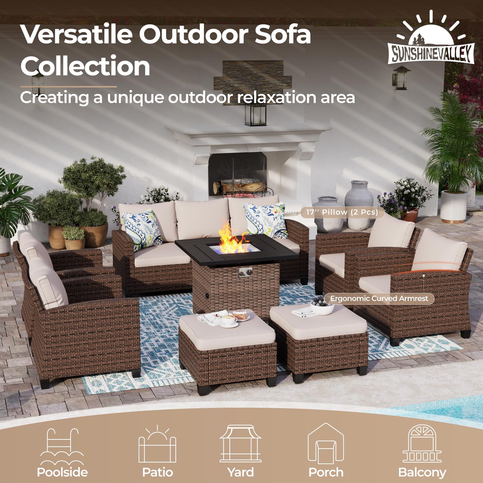 - VERSATILE PATIO FURNITURE SET Including 1 x 3-seat sofa, 4 x single chair, 2 x ottomans, and 1 x 32''firepit table, providing 9 seats. You can rearrange them according to your needs. Creating ample seats for your garden, lawn, backyard, poolside, porch, deck, balcony, and yard.
