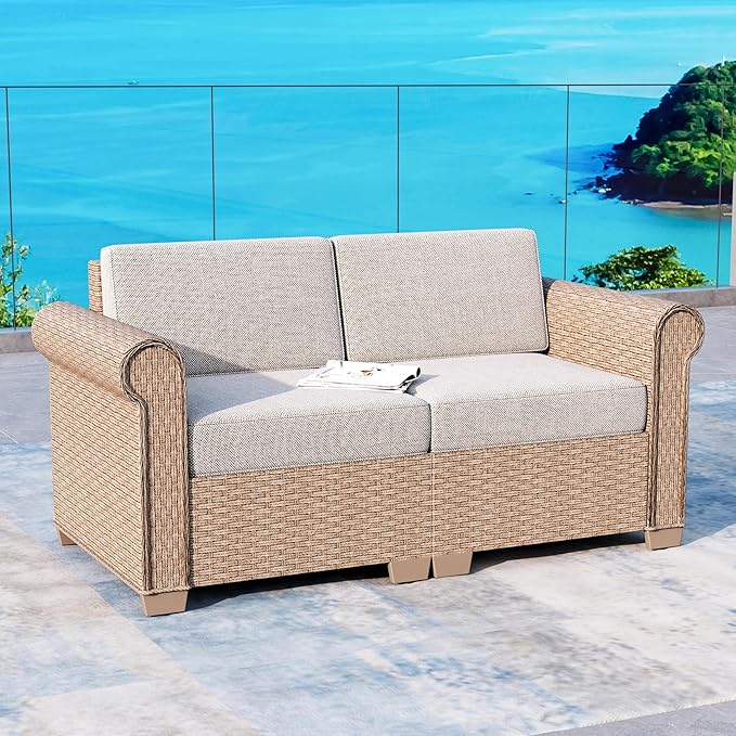 Patio Rattan loveseat, 2-Seat Wicker Rattan Sofa with 5.5" Thick Waterproof Cushions