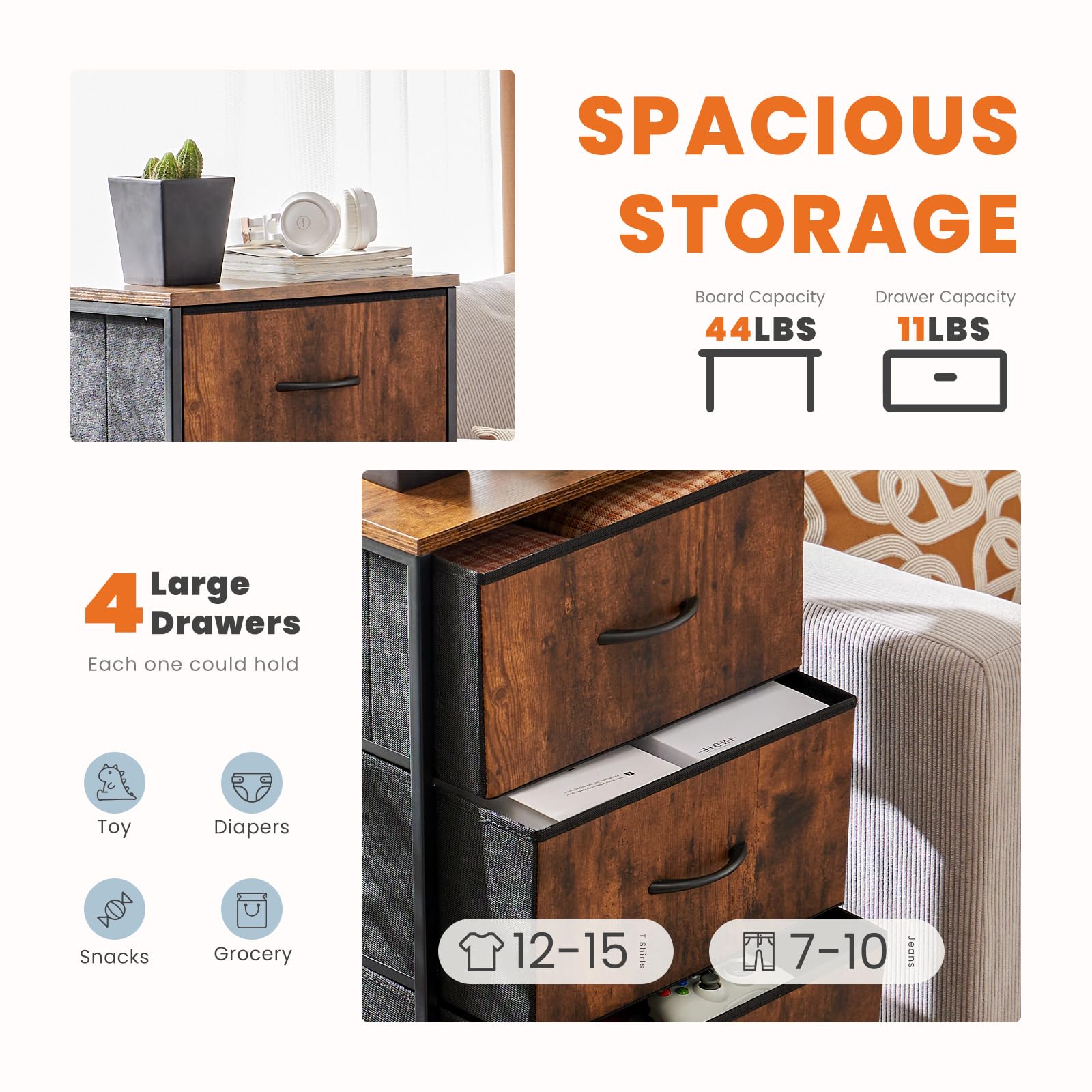 - Large Capacity This dresser offers sufficient space for daily necessities such as bookstoys, etc. 4 large drawers are to satisfy various storage needs. The shelves are perfect for lamps, and clocks without worrying about dropping. It works well in small areas while providing plenty of storage space and mixes & matches with storage dressers or chests of drawers for a unique home style.