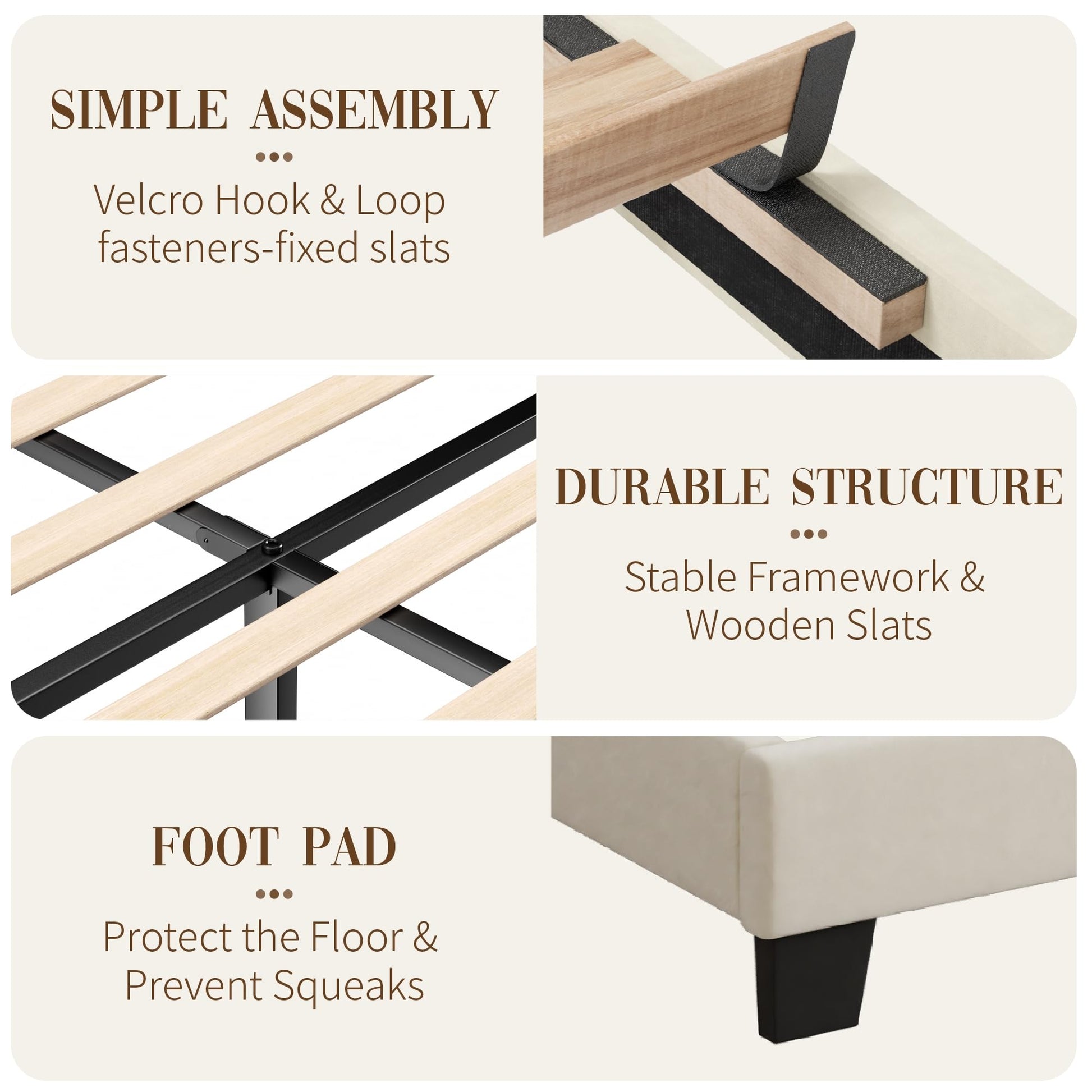 SwnftWinnt Queen Size Upholstered Bed Frame, Velvet Luxury Wingback Headback, Platform Bed with Deep Button Tufted & Nailhead Trim, No Box Spring Needed, Noise Free, Easy Assembly, Beige