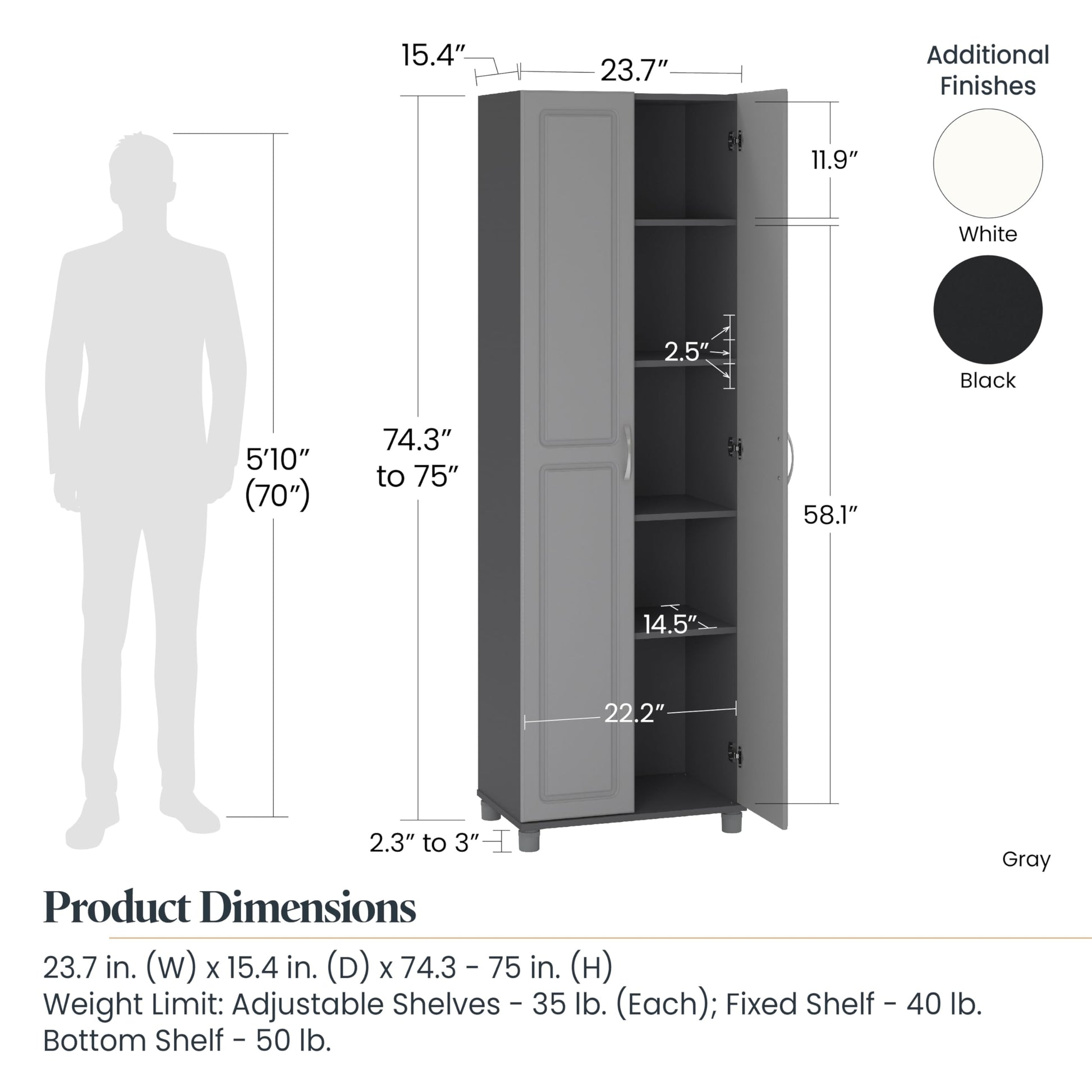 - The Storage Cabinet ships flat to your door and 2 adults are recommended to assemble. Each shelf will hold up to 35 lbs. Assembled dimensions: 74.25-75"H x 23.6875"W x 15.375"D