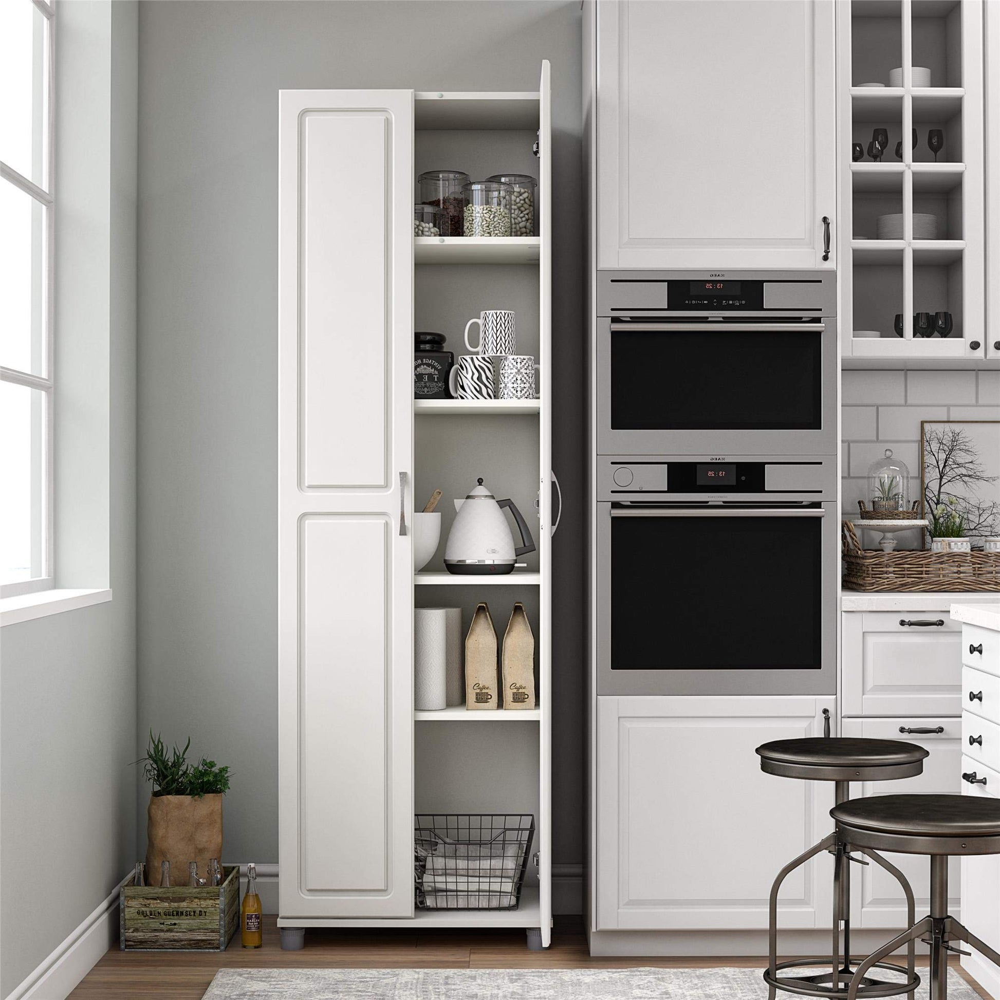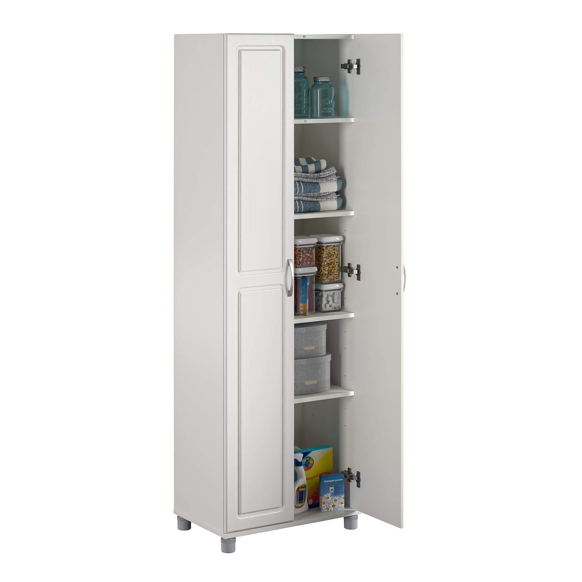 - The 5 shelves, 3 adjustable, can store and organize your cleaning supplies and even kitchen pantry items. Soft closing hinges prevent slamming doors. Adjustable feet keep your Cabinet level on uneven floors