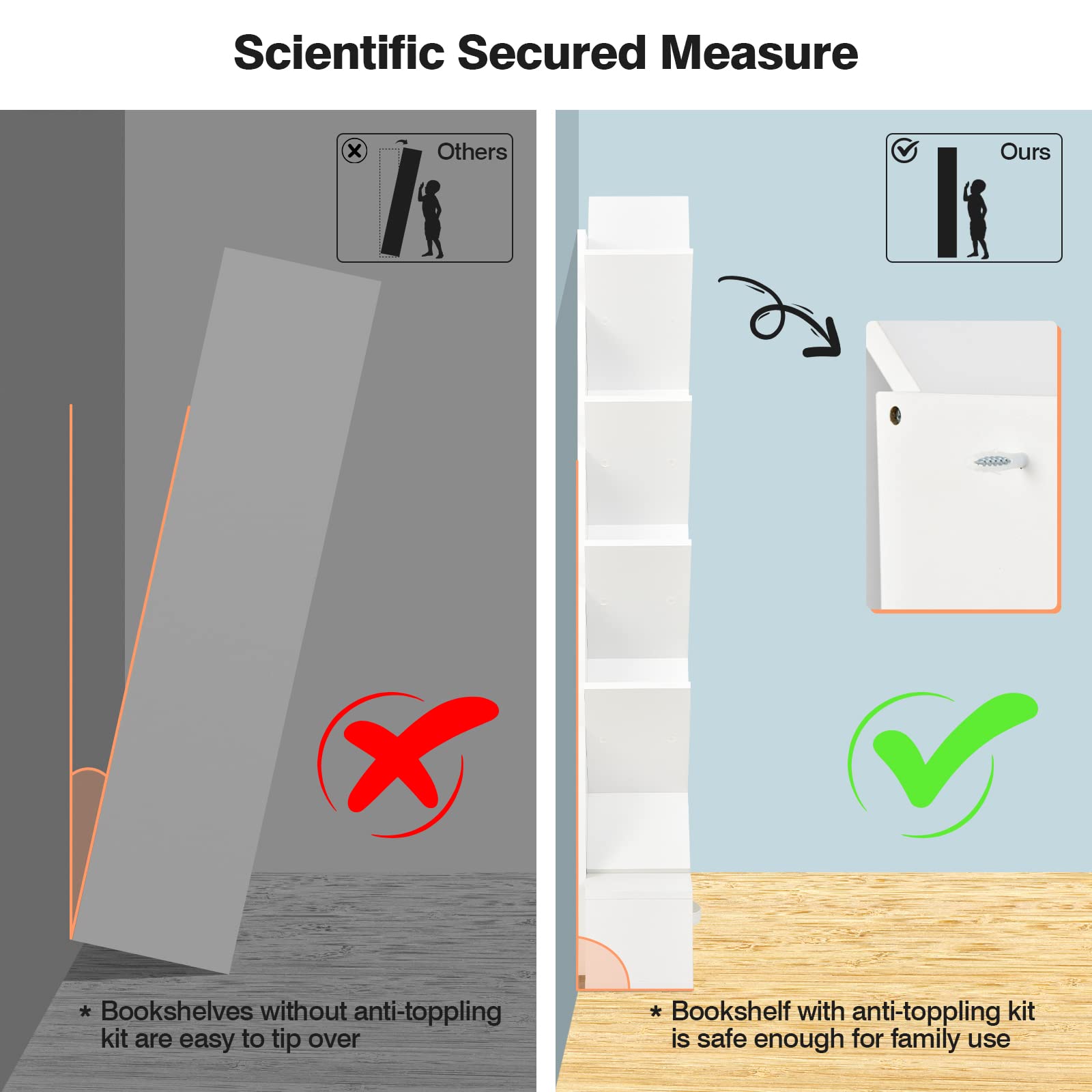 - Secured Construction: Thanks to sturdy materials, the tree bookshelf presents excellent weight capacity, allowing to accommodate more books and enabling to meet almost daily needs. Moreover, the included anti-toppling kit is another safeguard to fix tree shelf firmly to the wall without tipping over.