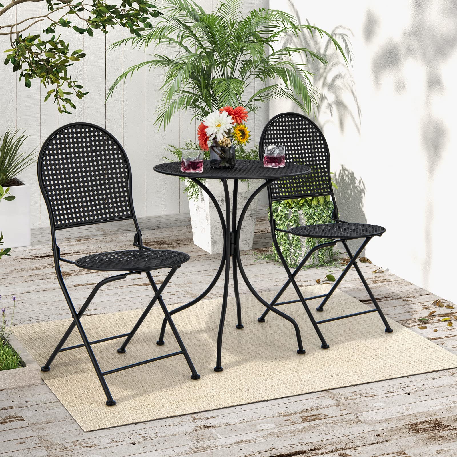 Enjoy cozy moments outdoors with this 3-piece patio bistro set, featuring 2 folding chairs and 1 round table. Perfect for your garden, balcony, porch, or yard, it provides a comfortable spot to relax with family or friends while adding a stylish decorative touch.