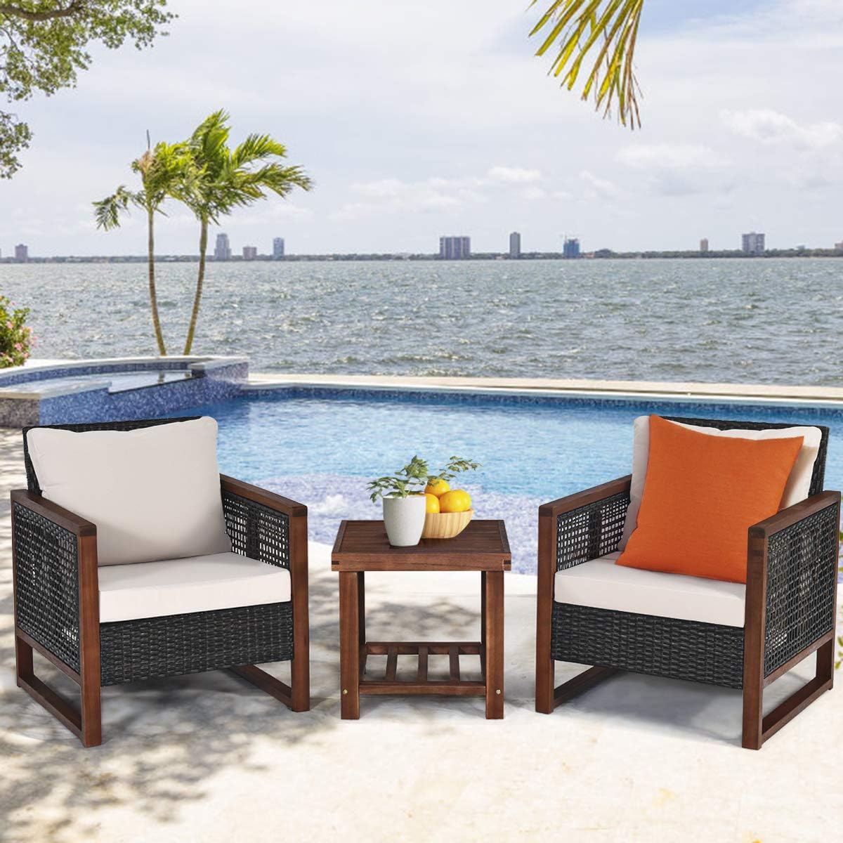 - Comfortable & Breathable Rattan Chairs: Constructed of weather-resistant rattan and acacia wood structure, these two chairs have a long service life and are very suitable for outdoor use. The ergonomic high backrest and wide armrests can provide you with more comfortable support. More, the reinforced base design ensures a load-bearing capacity of up to 360 lbs.