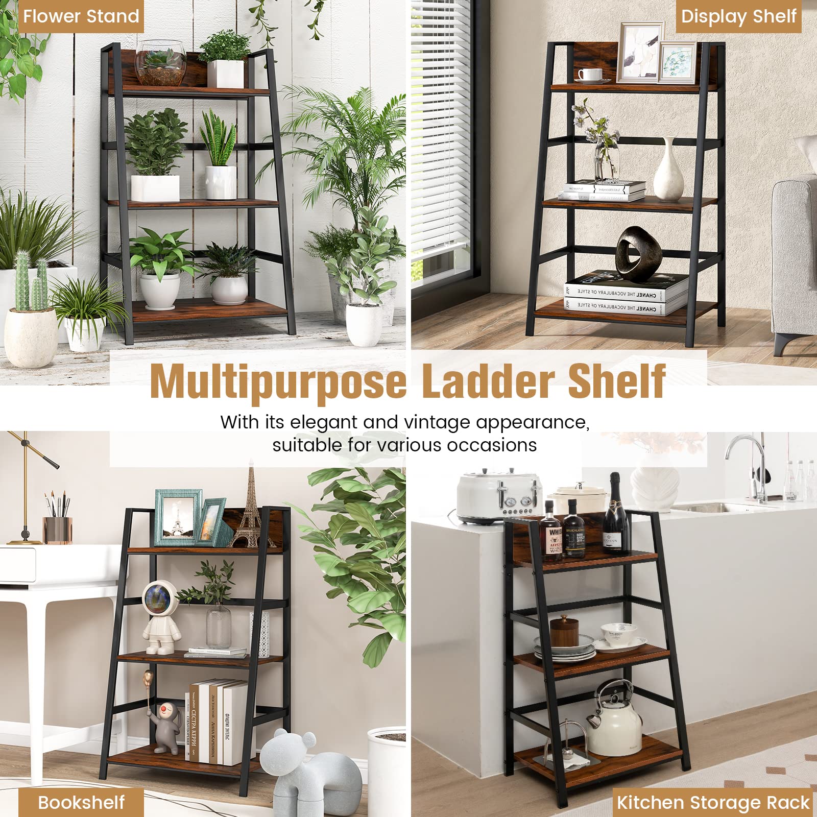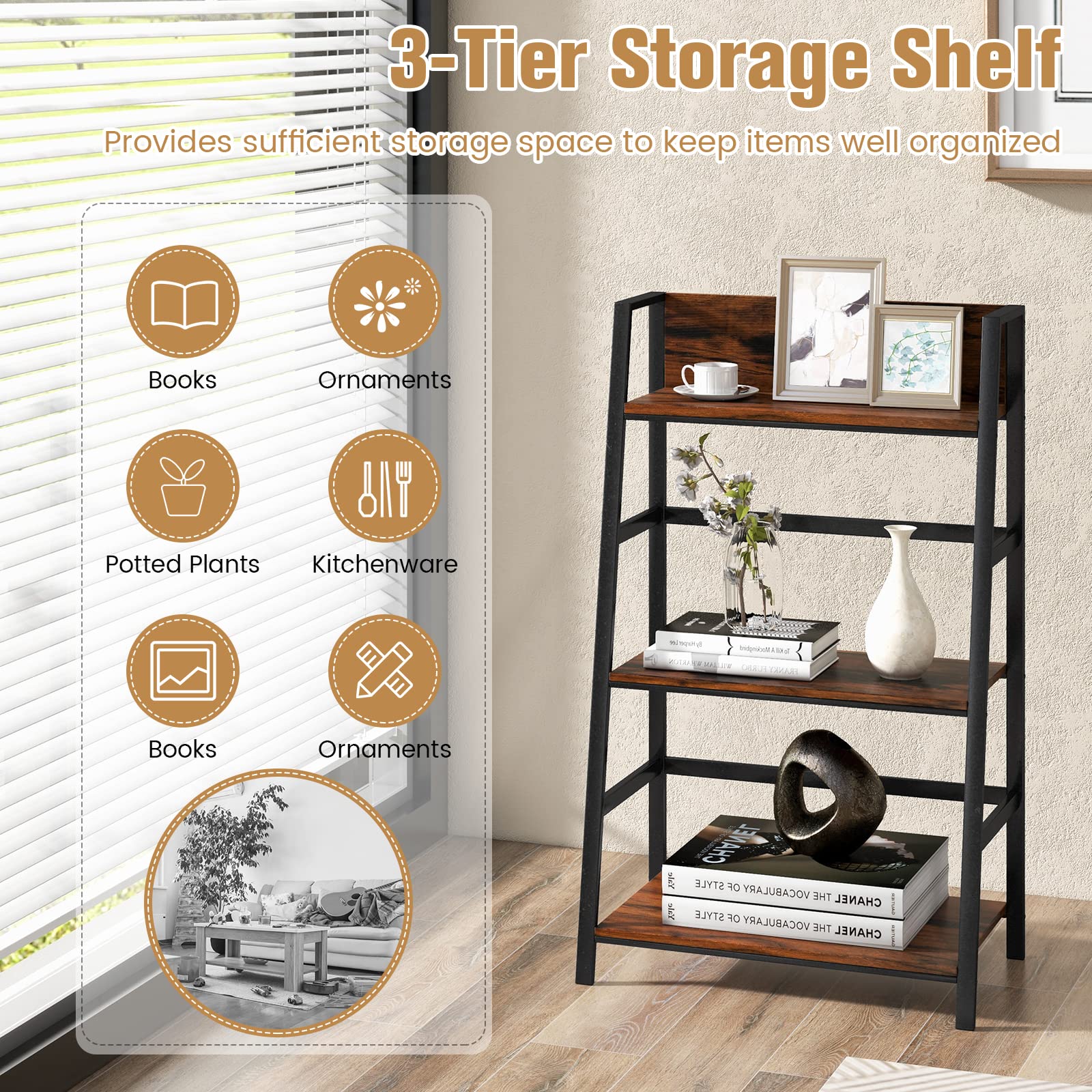 Tangkula 3-Tier Ladder Bookshelf, Industrial Wooden Bookcase w/Metal Frame, Anti-Toppling Device, Freestanding Display Shelf Plant Stand, Storage Rack for Home Office Living Room (1, 3-Tier)
