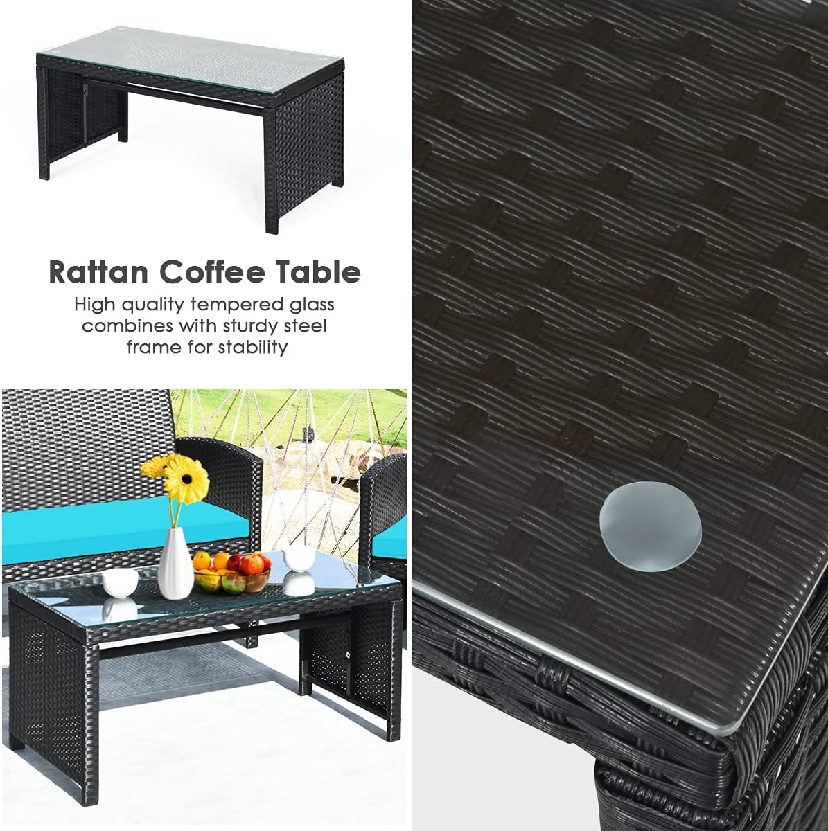 - Comfortable Patio Sofa Set: This conversation set with 1 loveseat, 2 single sofas, and 1 coffee table can perfectly satisfy the seating needs of a group of people. Our 4-piece wicker set features comfortable cushions (pillows in the pic are not included) that are made of durable polyester fabric and soft sponge. You and your family will enjoy the leisure time when seat on the sofa.