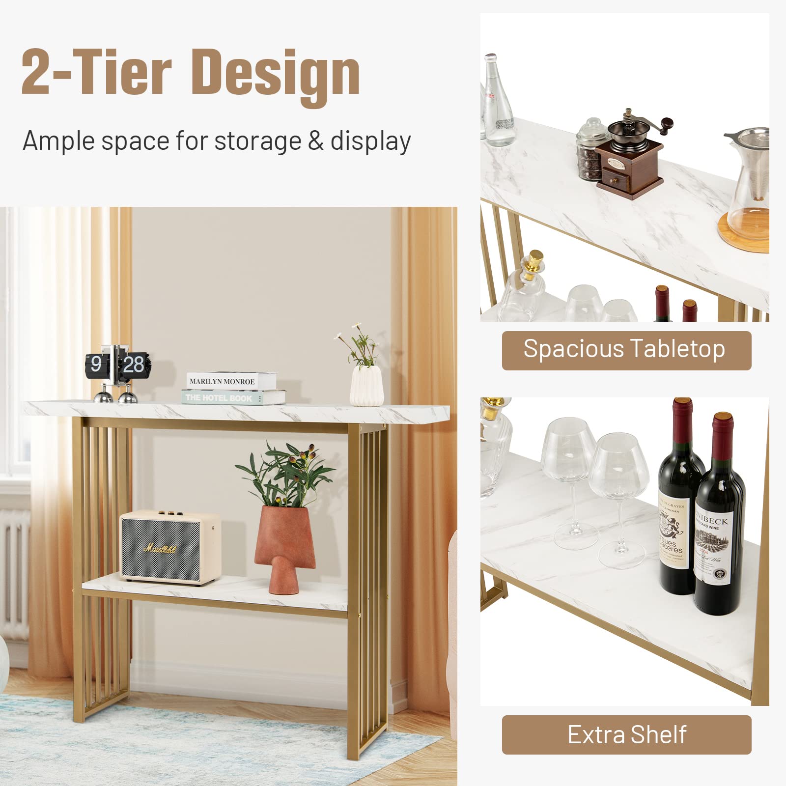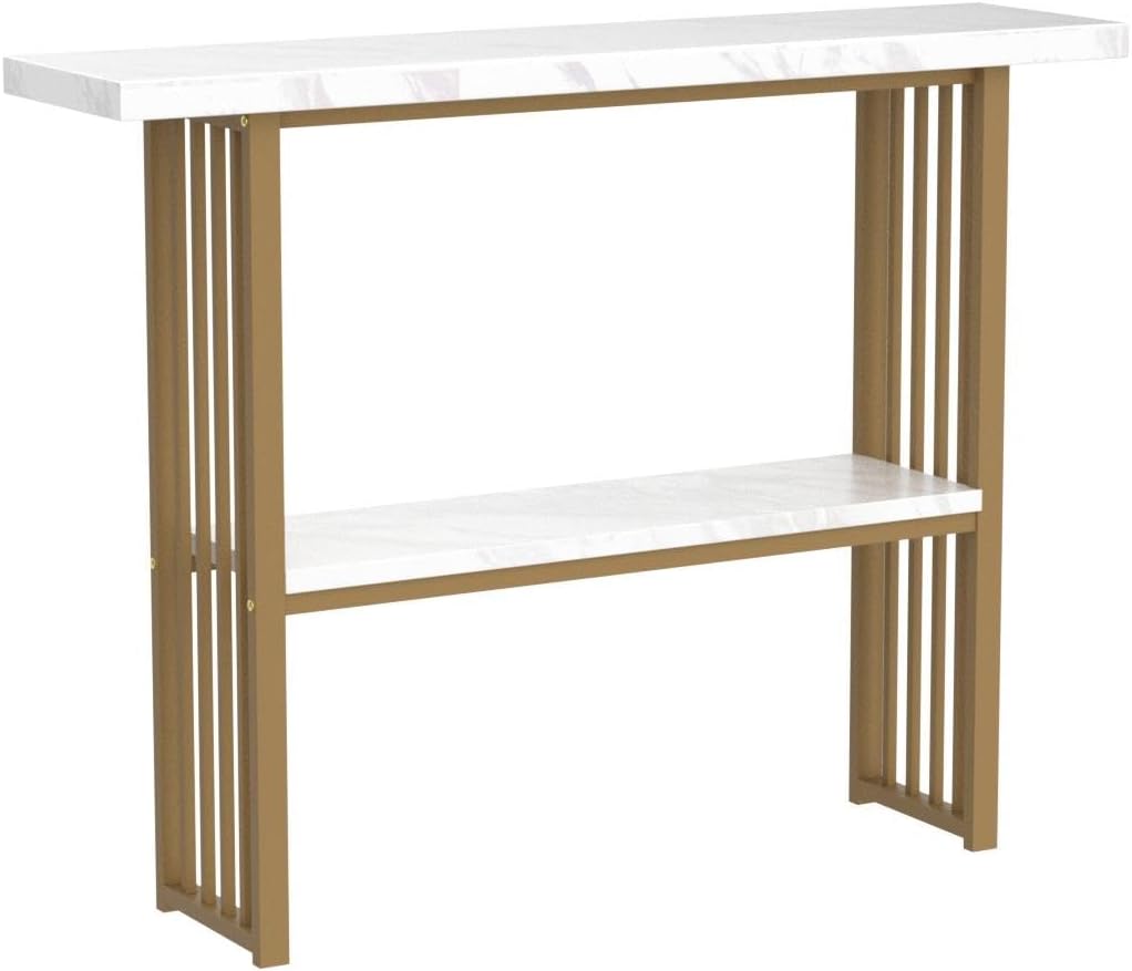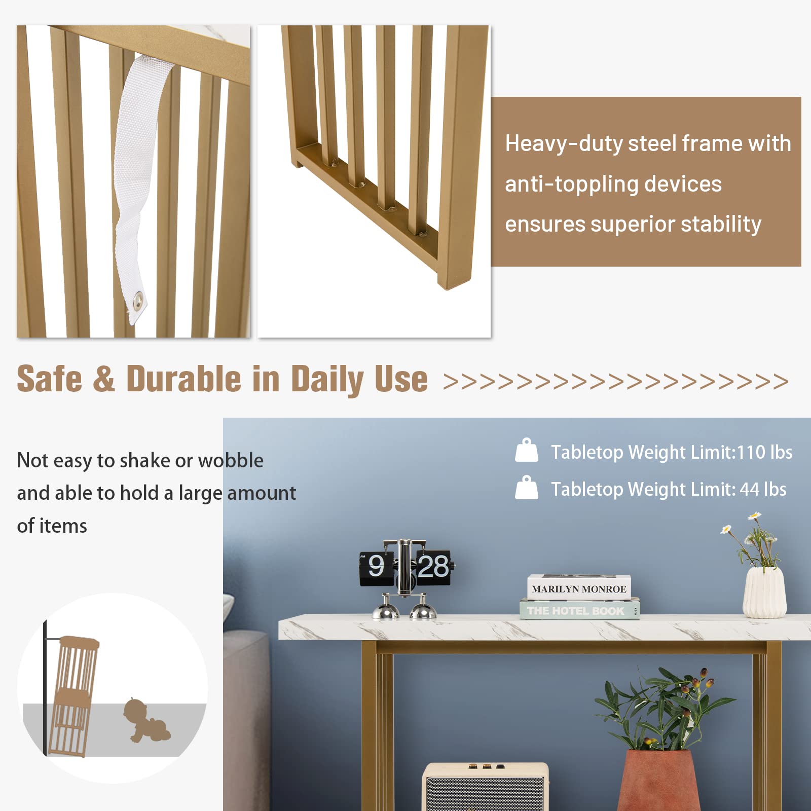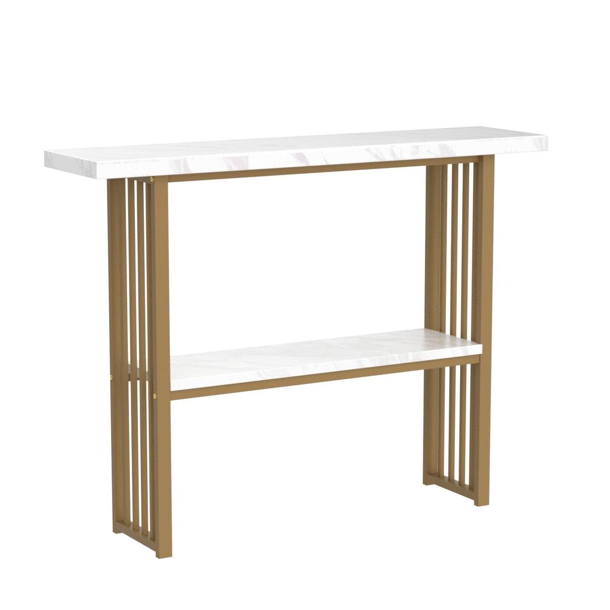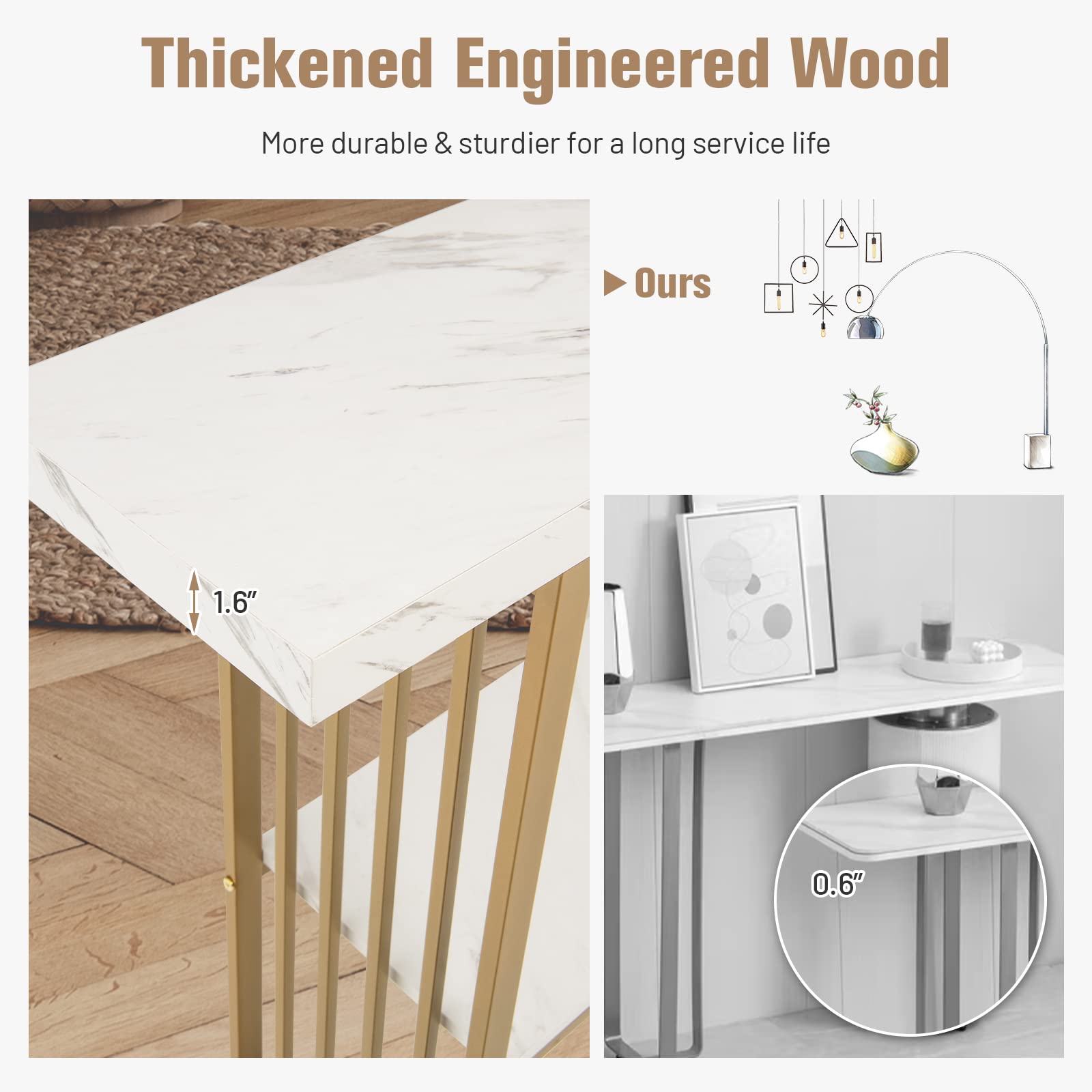 - The design of the narrow console table attaches great importance to aesthetic value. With the white faux marble tabletop and gold-finished metal frame, the sofa table looks stylish and elegant, bringing a deluxe appeal to improve the interior furnishing to the next level.