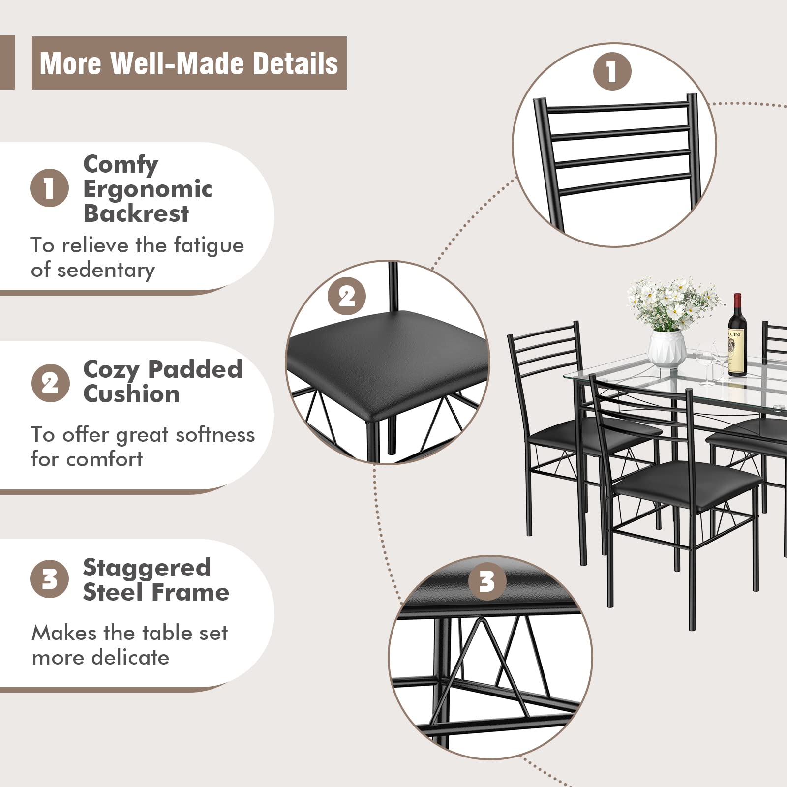 - This set of table and chairs pursues concise design. Because of its concise and fluency design, putting it in your home is a great addition. Elegant design can be perfectly integrated with any decoration style.
