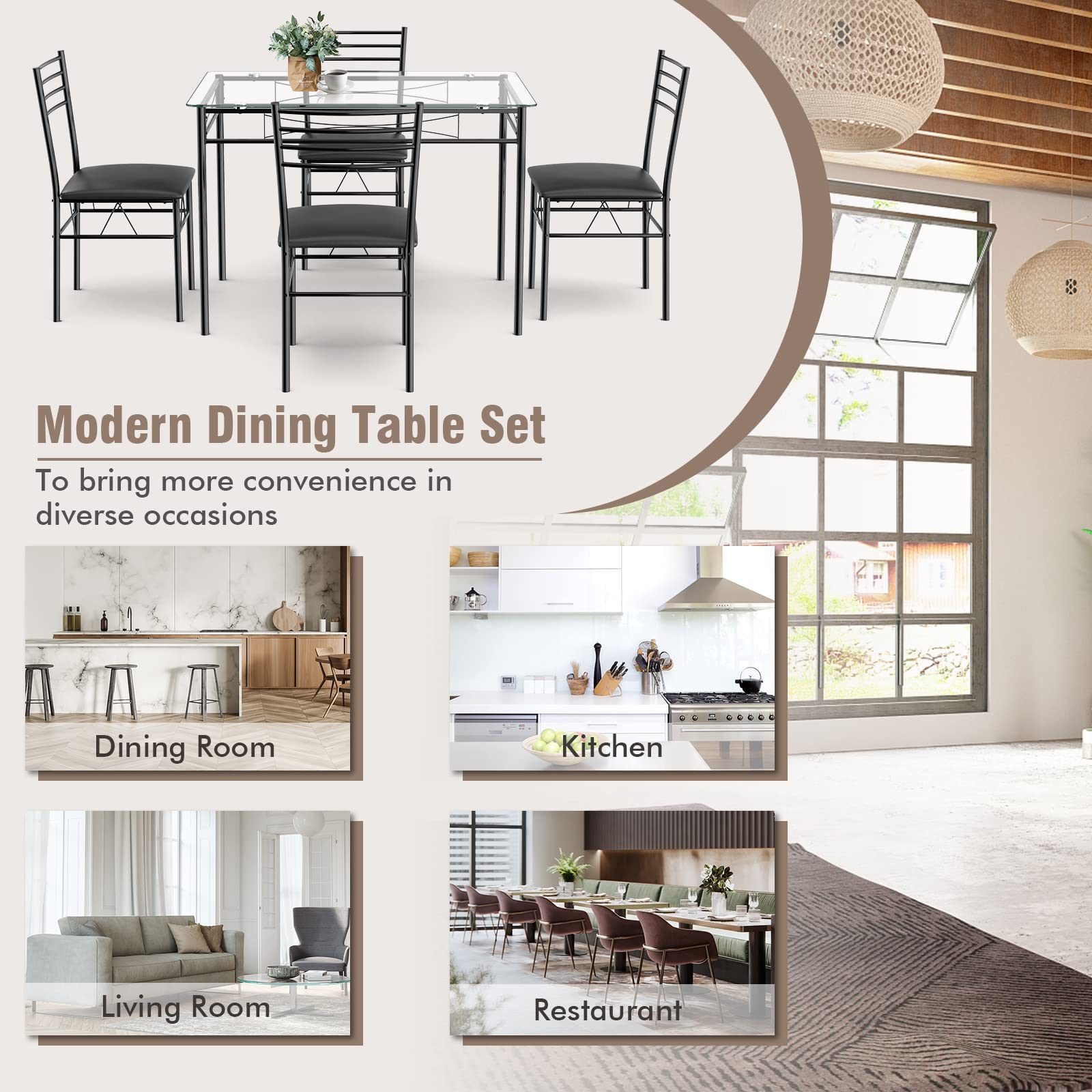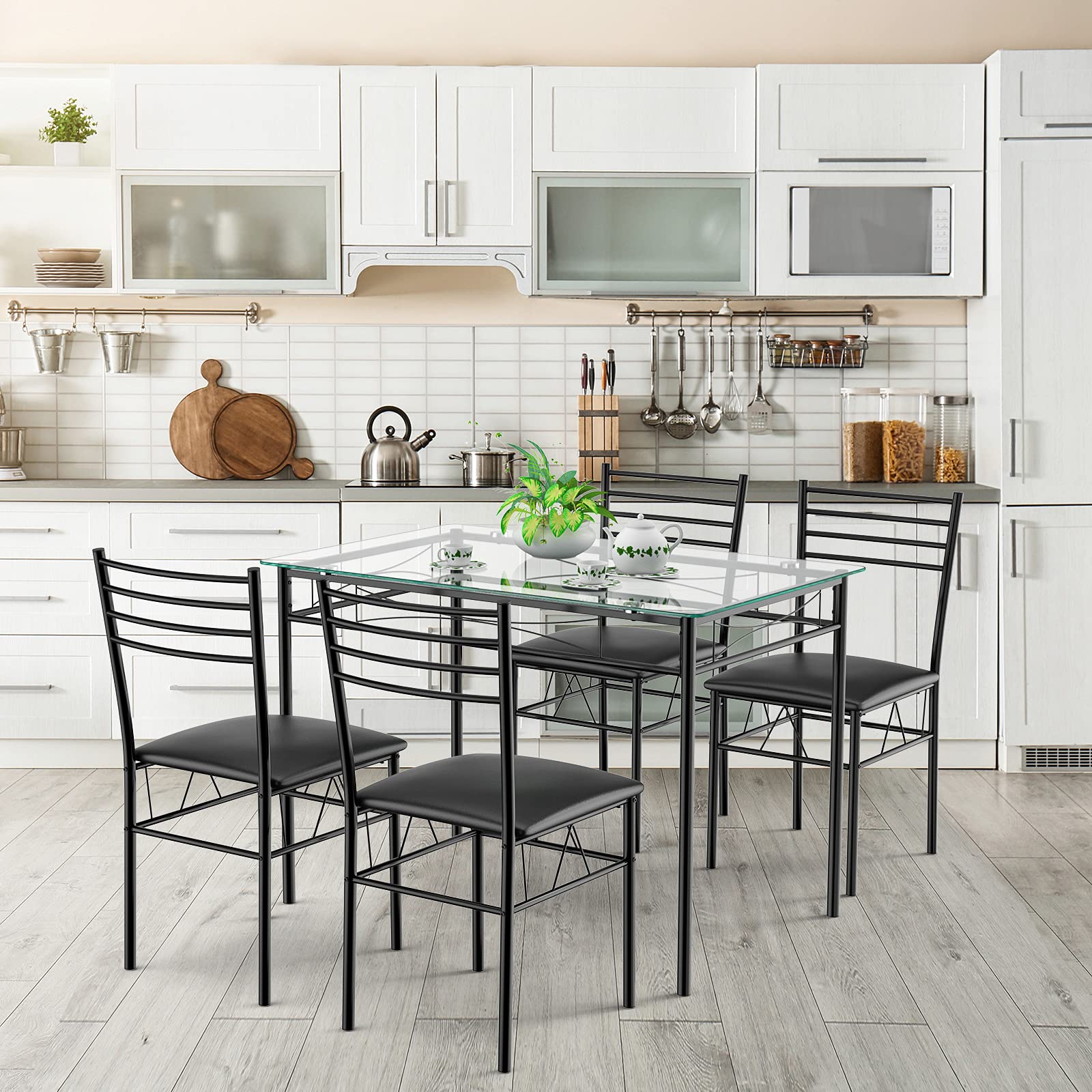 5 Pieces Dining Set 4 Person Home Kitchen Glass Top Table and Chairs Breakfast