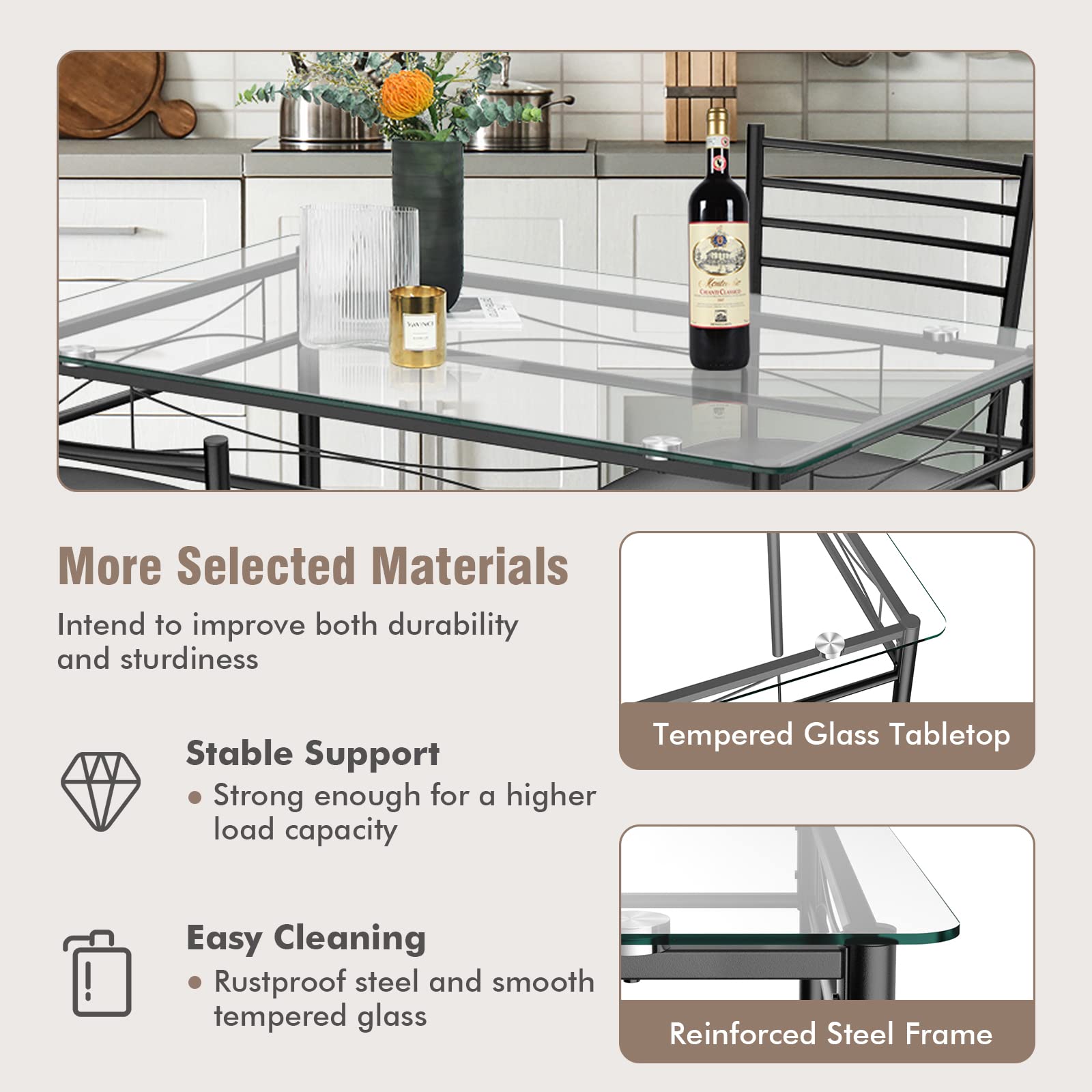 - This tabletop is made of tempered glass that is sturdy and durable. Constructed by premium metal frame, this set will provide you years of reliable use. The joint is fixed by high quality screw and connected tightly to strong load-bearing capacity. This set can meet your daily life easily.