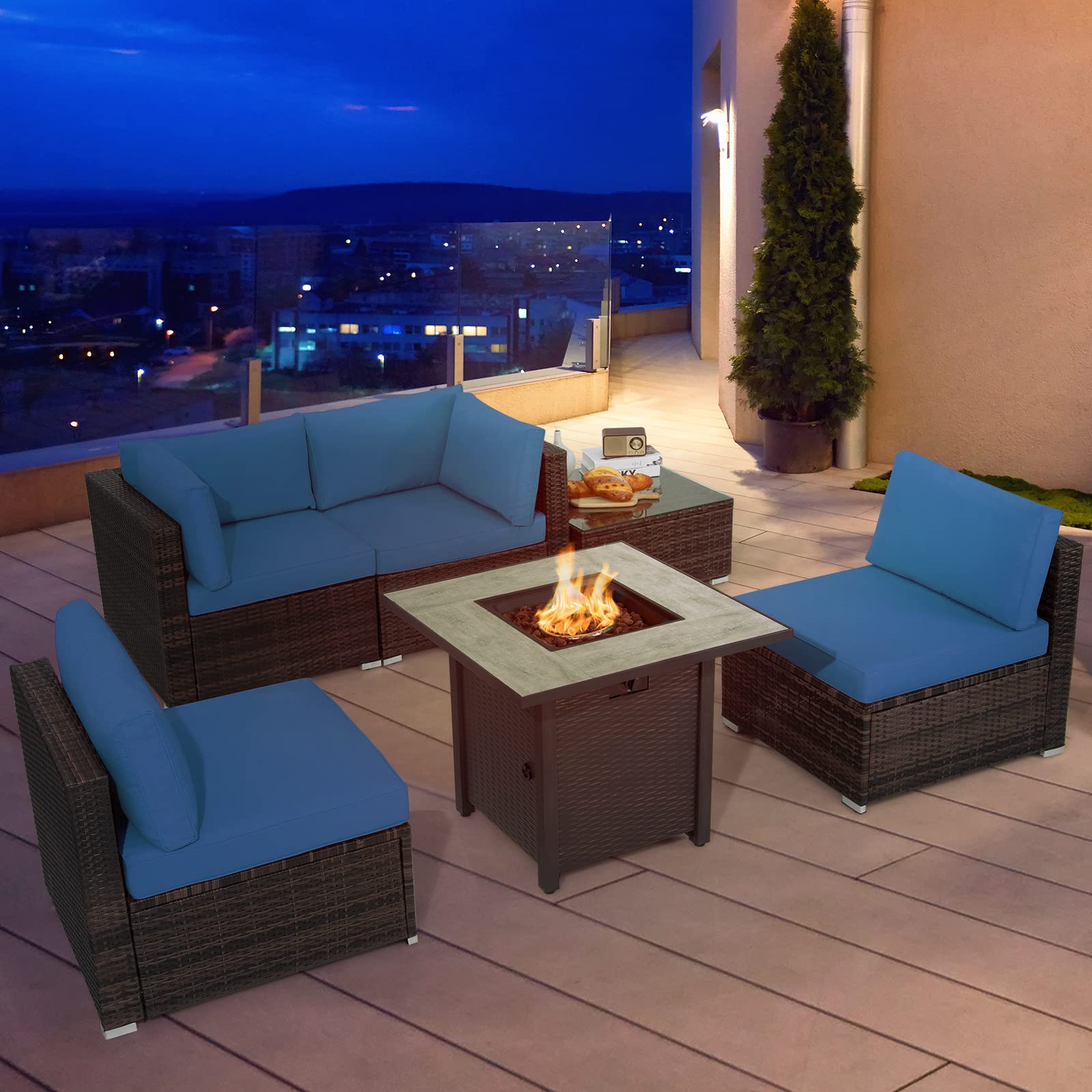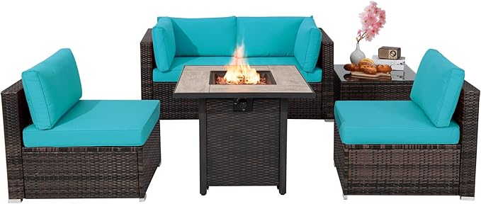 - Multiple Combining Ways: This patio set includes 1 fire table, 1 coffee table, 2 corner sofas and 2 armless sofas. You can arrange the 6 pieces as you like to fit to the size of your backyard. The coffee table with tempered glass top allows you to easily fetch items you want. Also, the fire pit table comes with a dustproof cover, which gives considerate protection when not in use.