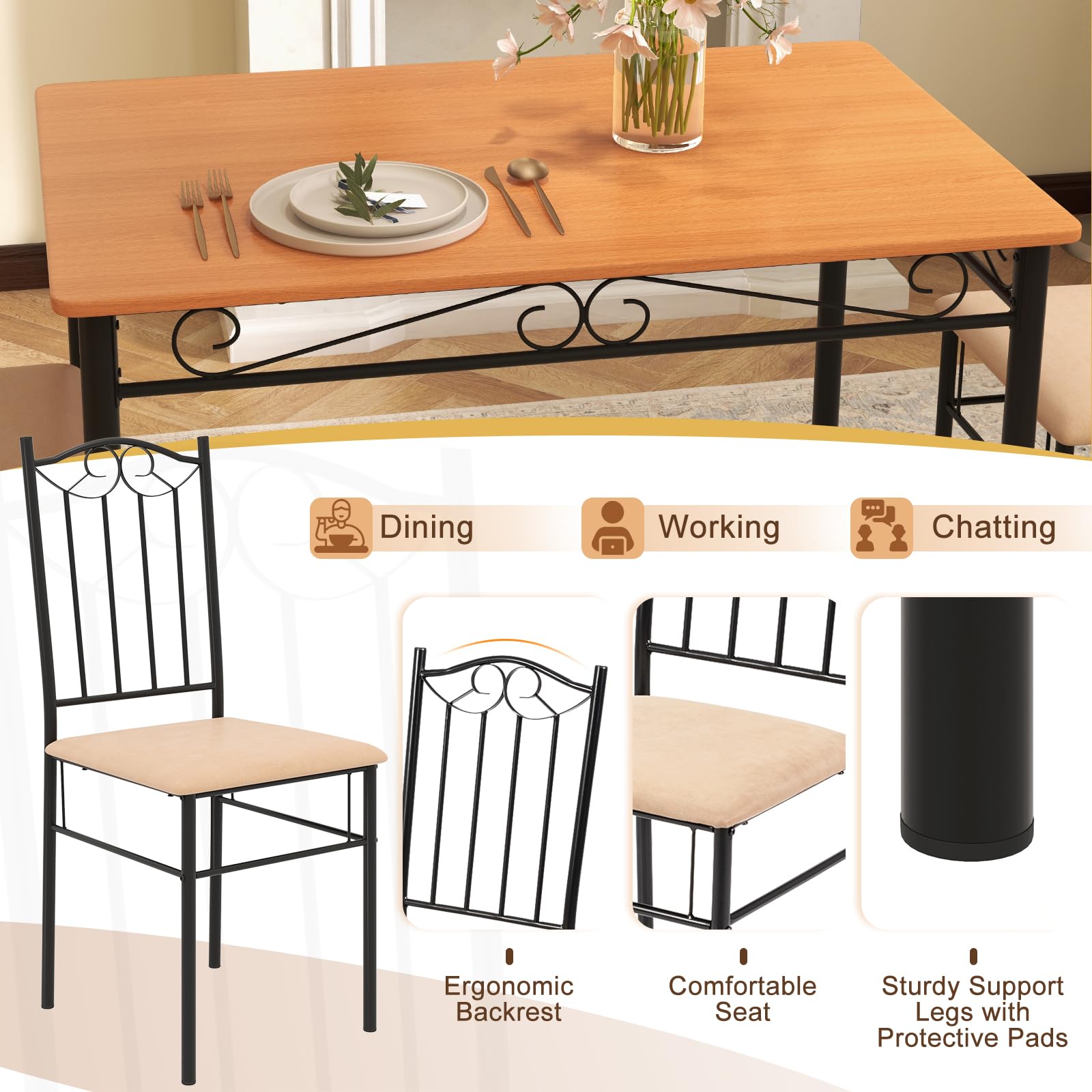 Dining Table Set for 4, Dining Room Table Set with Metal Frame & Padded Seat