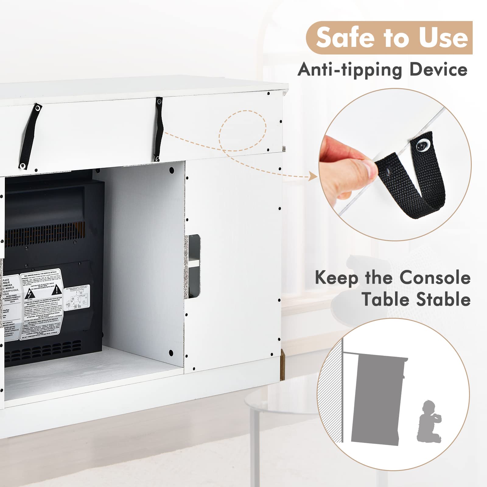 - Sufficient Storage Space: This fireplace TV stand also possesses ample space for your daily storage with a wide countertop, two open shelves, and two side cabinets. The countertop is available for TVs up to 50”. The upper shelf in the side cabinet can be adjusted into 3 positions for items of different sizes.