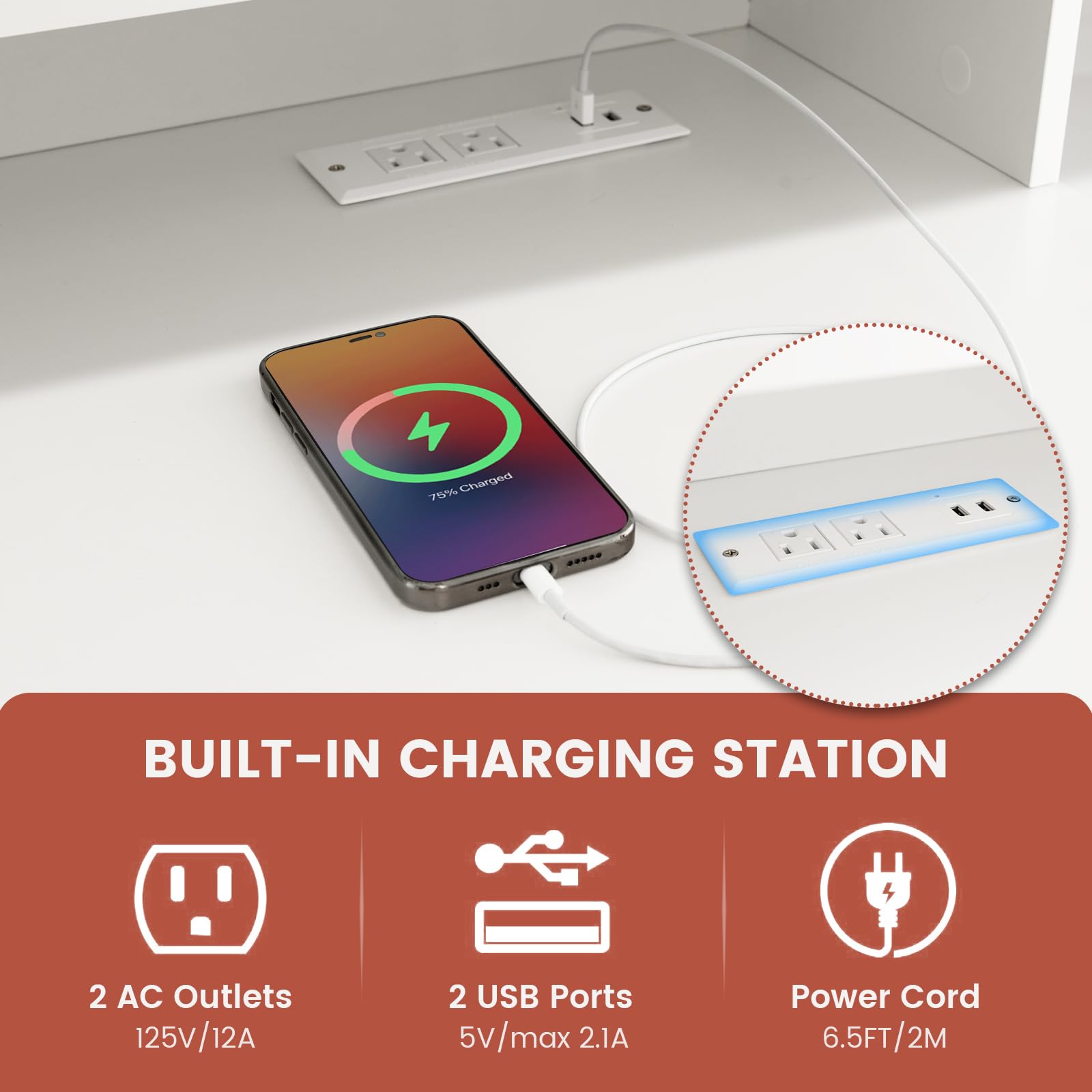 - This white computer desk is equipped with 2 AC outlets and 2 USB ports, allowing you to conveniently charge your devices and eliminate the need for messy extension cords. Stay connected and powered up during working!