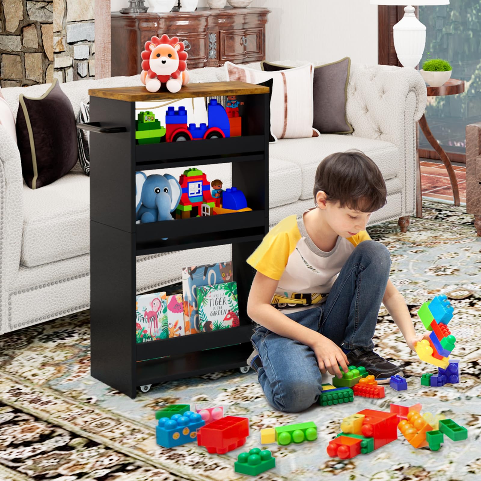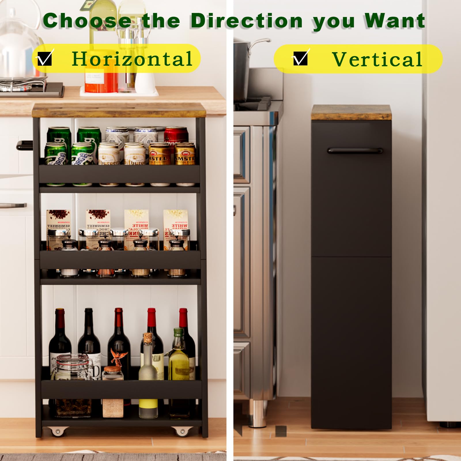 - Narrow Spaces Storage Design This 4-tier storage cart is 7.9 inches wide and has plenty of storage space. It has 4 smooth wheels and 1 convenient handle. Can be used in closets, kitchens, bathrooms, garages, laundry rooms, offices, or washing machines and dryers.