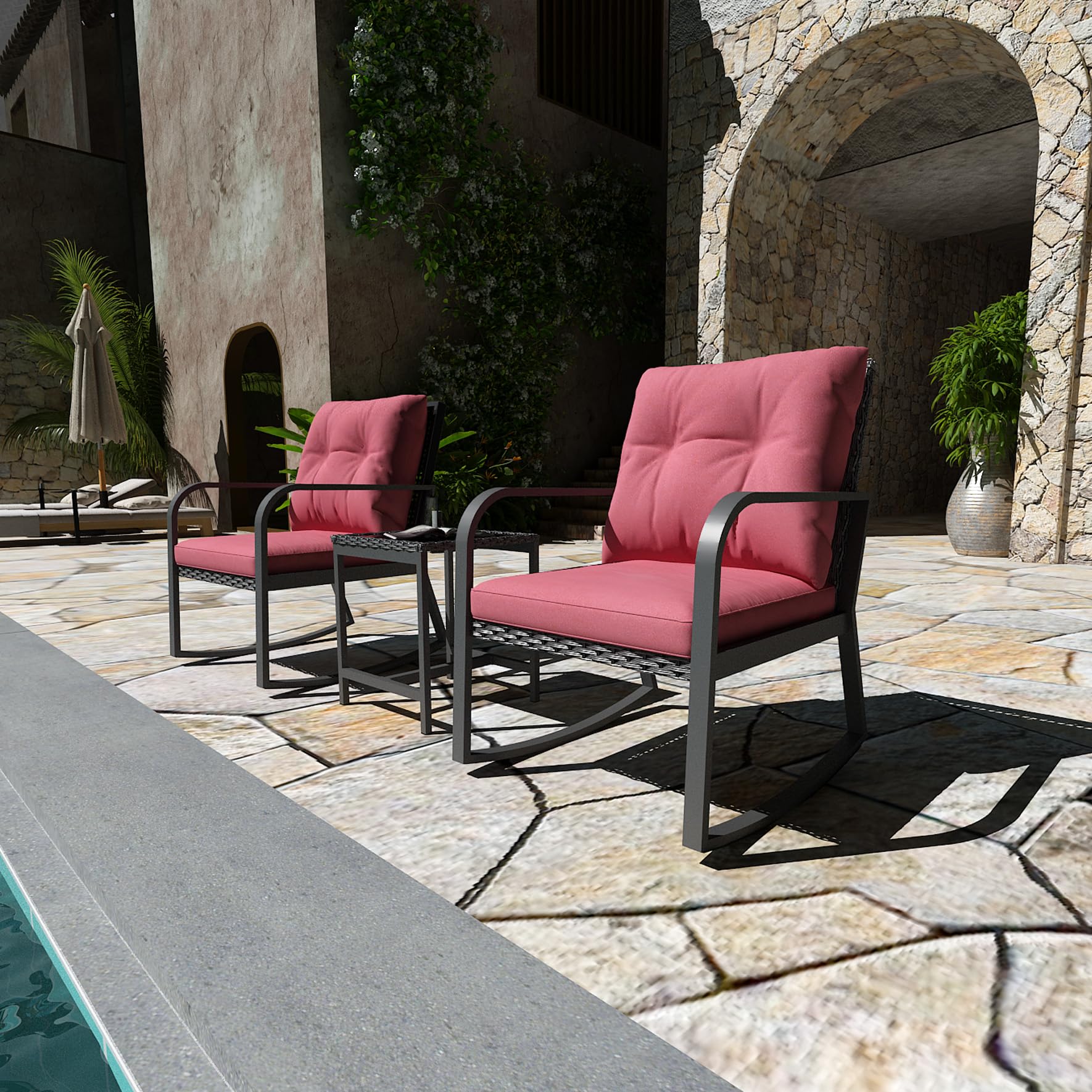3 Pieces Patio Bistro Set Outdoor Rocking Chair w Cushion for Yard Garden Poolside (Red)