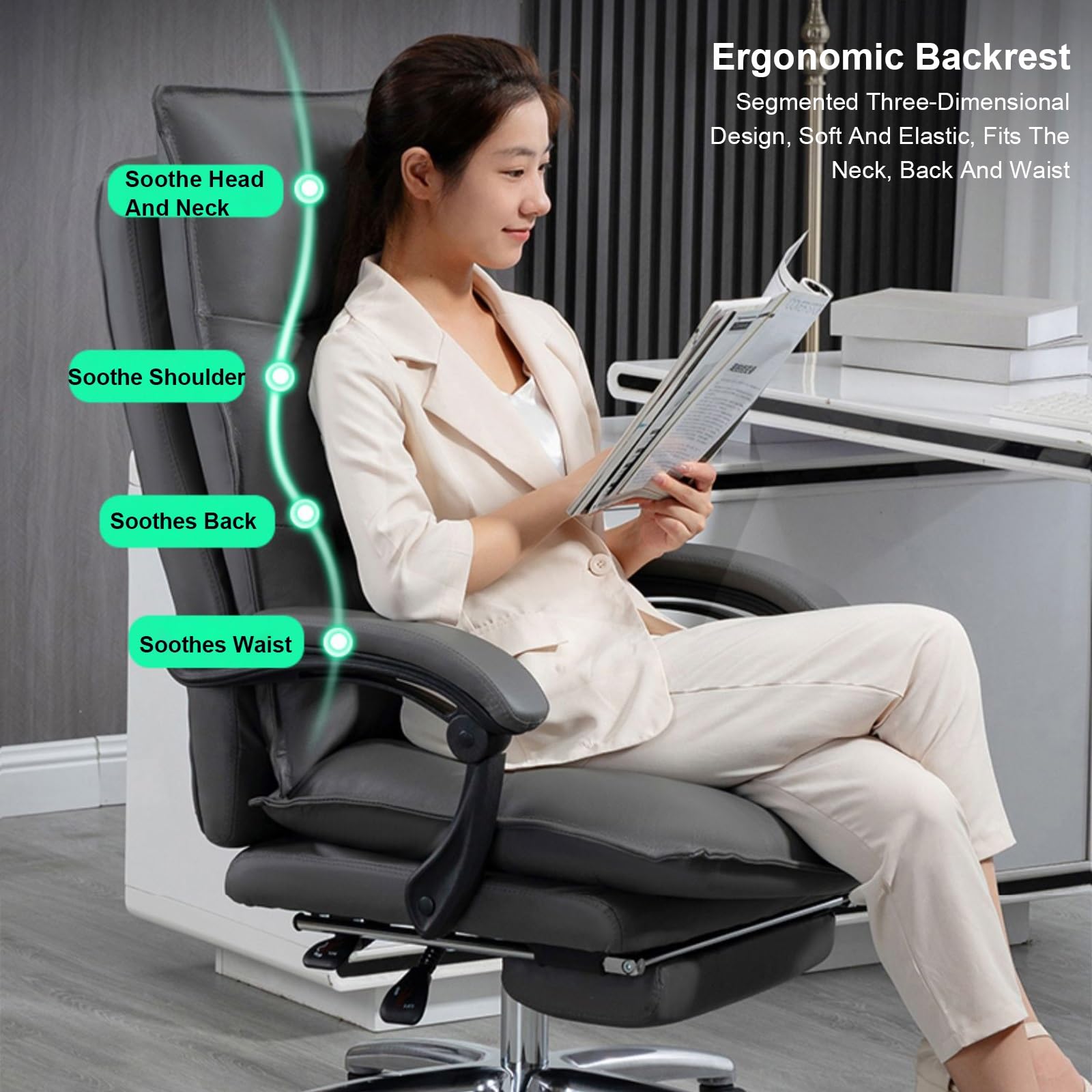 - Suitable for home office This Office Chair, The segmented three-dimensional design of the backrest fits the curves of the human body and is comfortable for your neck, back and waist. It is very comfortable to sit and work for a long time. The armrests are wrapped in soft leather, making them soft and comfortable for daily use, Comfortable support for your hands.