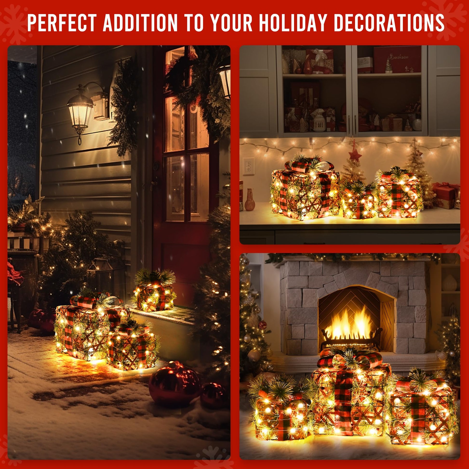 - Perfect outdoor Christmas decorations: The rattan attached to the surface of the gift boxes is very durable, and the gift boxes have a sturdy metal frame inside, able to withstand wind and rain, making them perfect for yard and porch Christmas decorations.