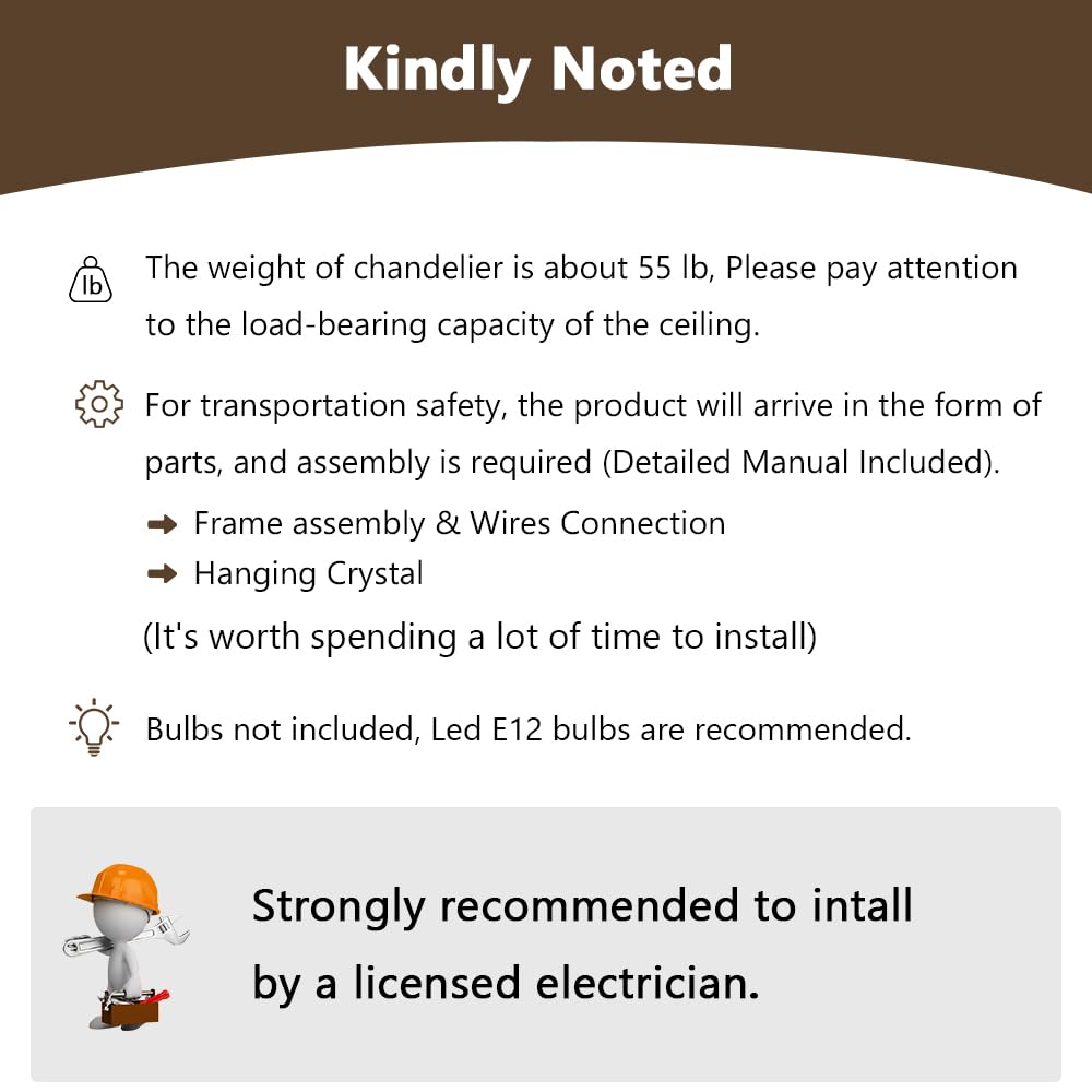 - Bulbs are not included. This crystal lights requires 24 x E12 bulbs(MAX 40W), and we suggest you warm light bulbs for the best crystal chandelier appearance.