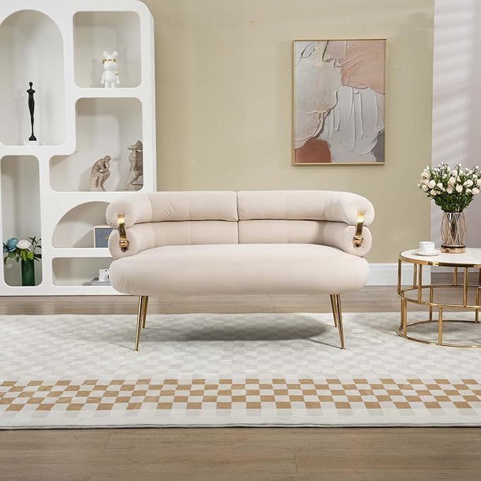 - FASHION ELEMENTS - Golden tapered metal legs, a shiny decorative piece on the armrest, soft velvet surface to contain thick padding, all these fashion elements combined together not only provide you with better comfort but also make this small love seat sofa stand out, giving your living room richer colors.