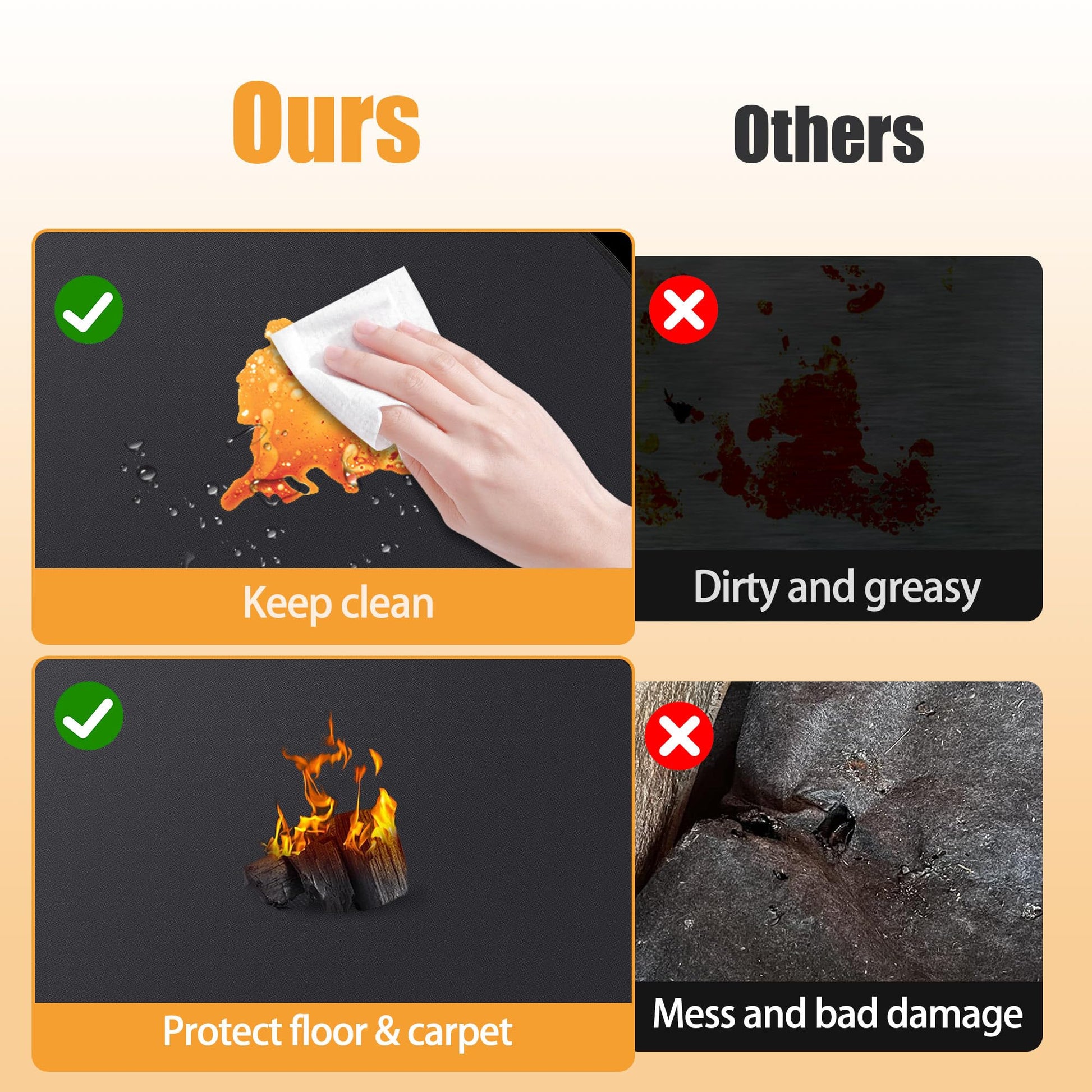 - Wide Application Our fiberglass fire resistant fireplace mat can protect floors, carpets, decks, garage floors, patios and other surfaces from spills such as fireplaces, outdoor grills, stoves, chimineas or damage caused by dripping water around them.