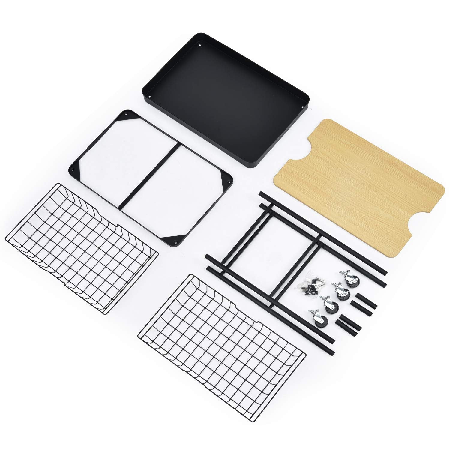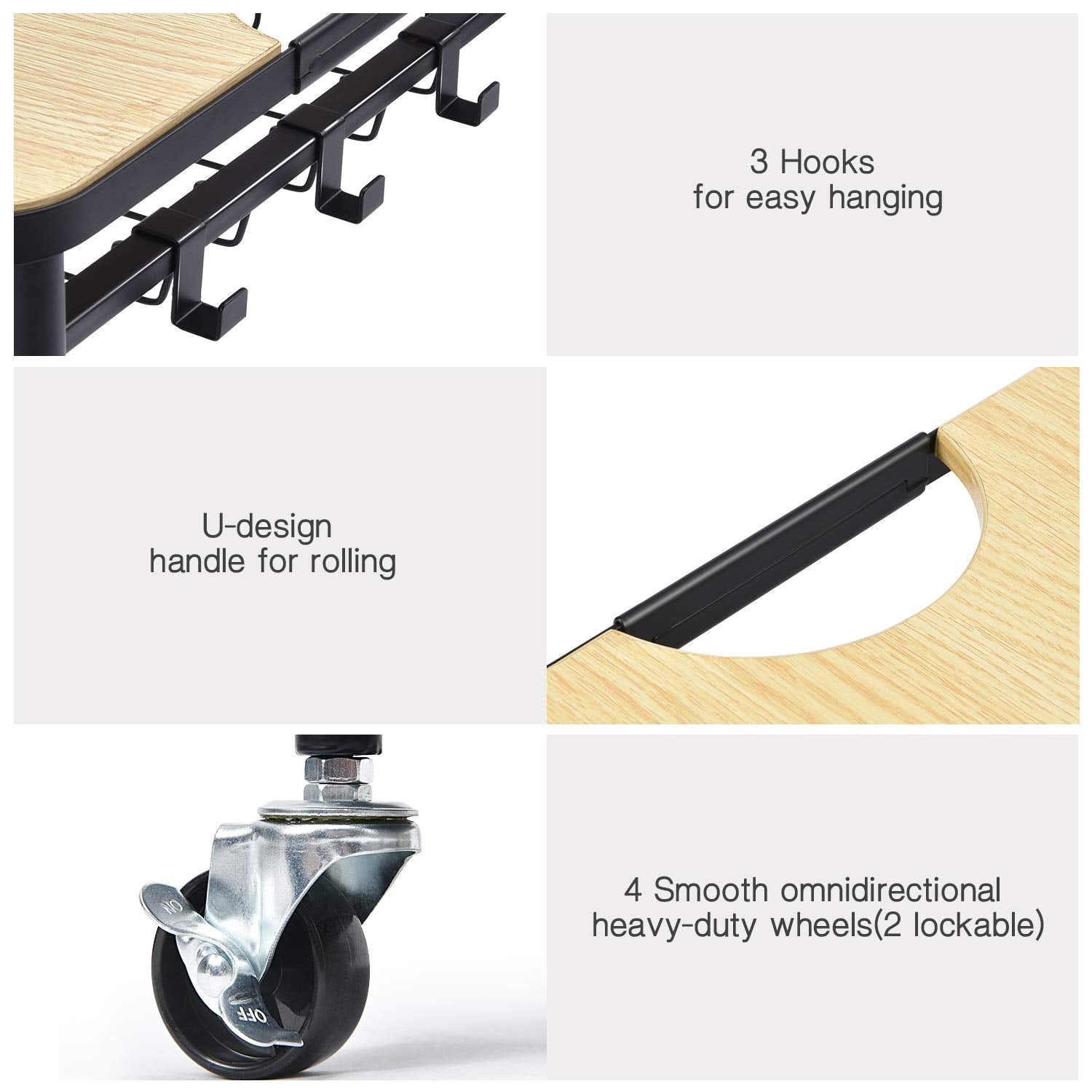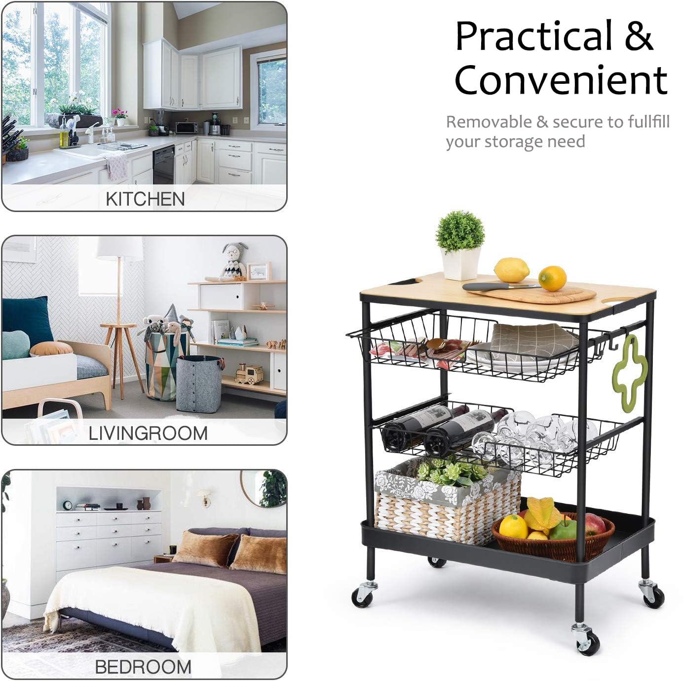 - Featured a wood table and 3-tier storage layers and 3 hooks. The tabletop provides extra counter space for kitchen appliances or cutting board. The 2nd/3rd basket drawers can be pulled out to store.