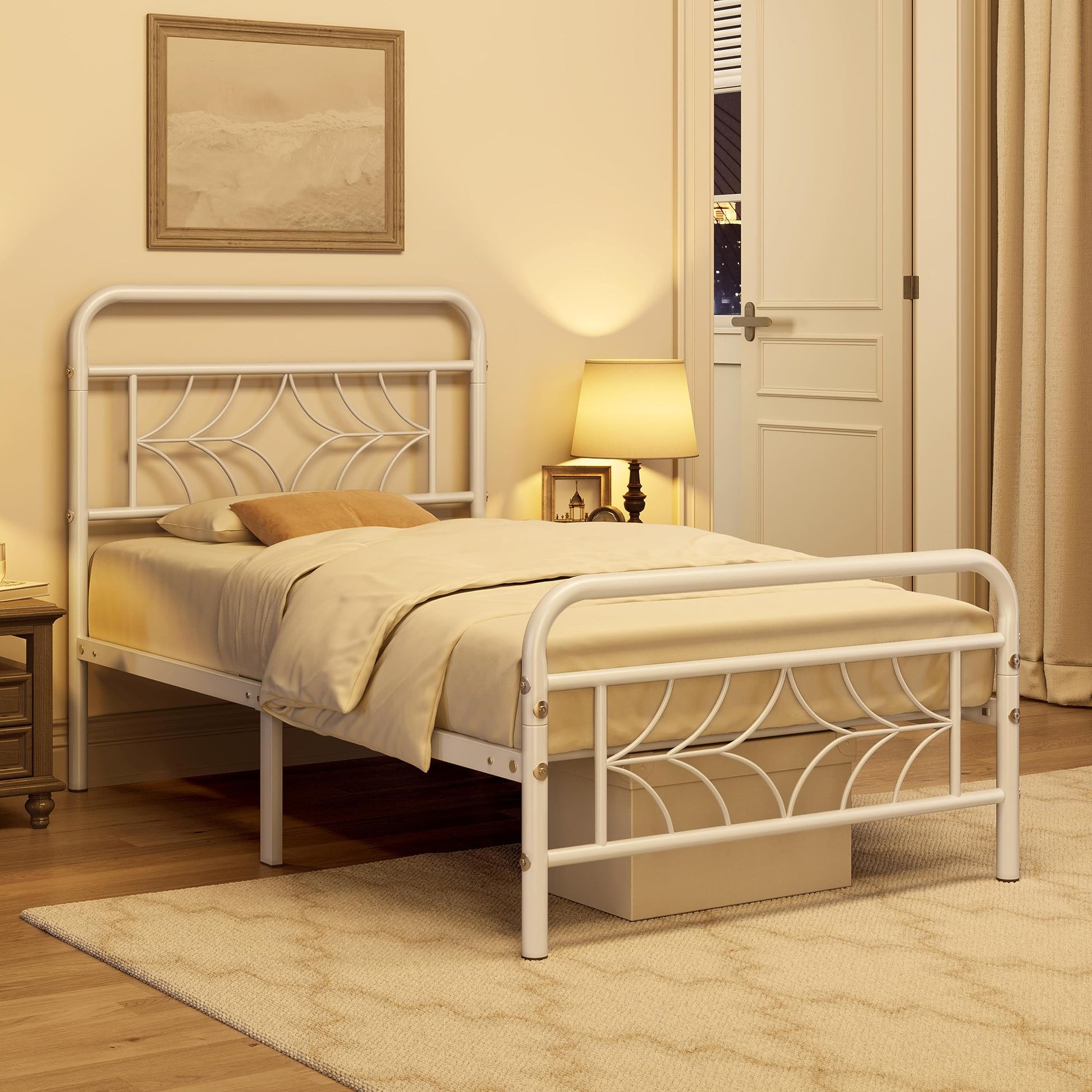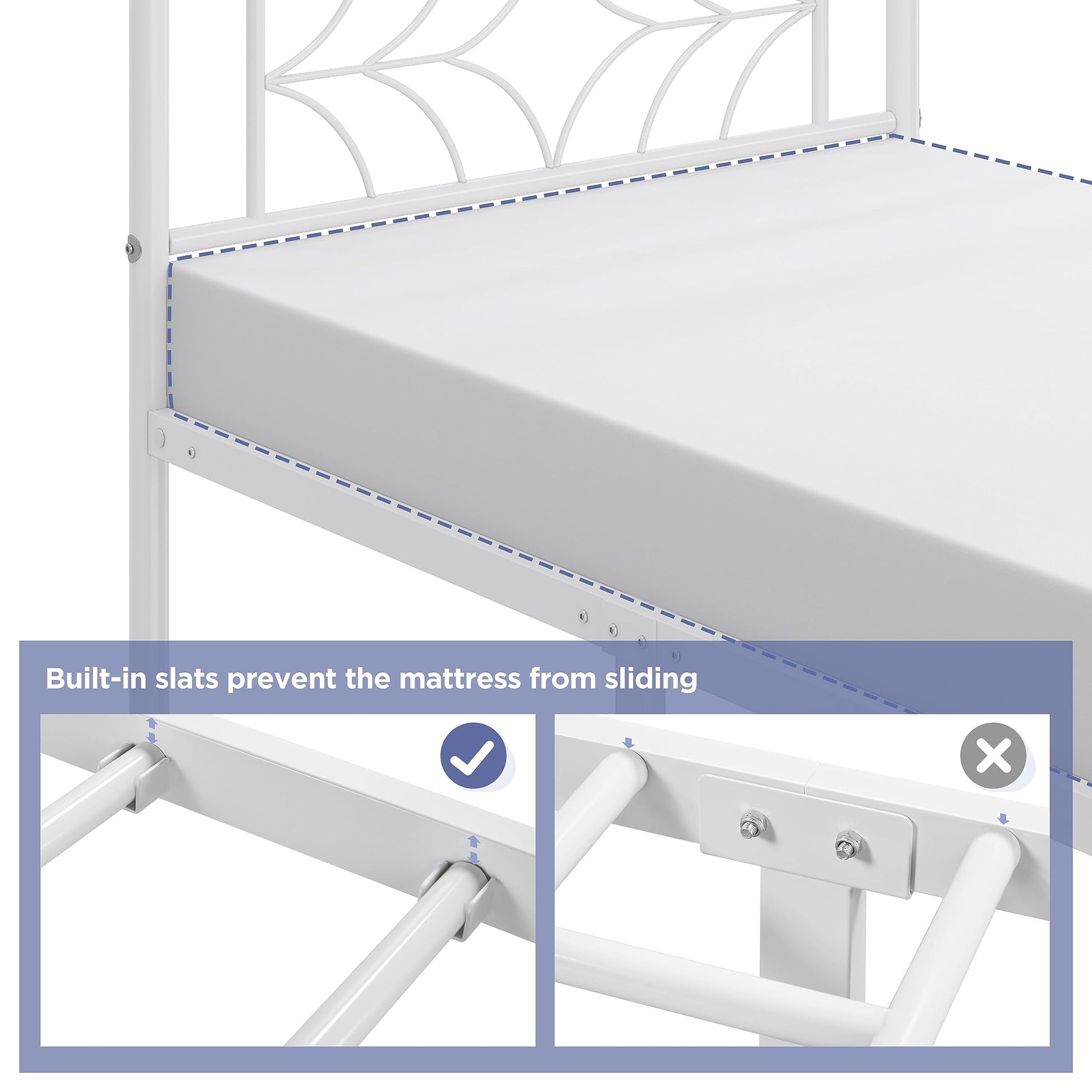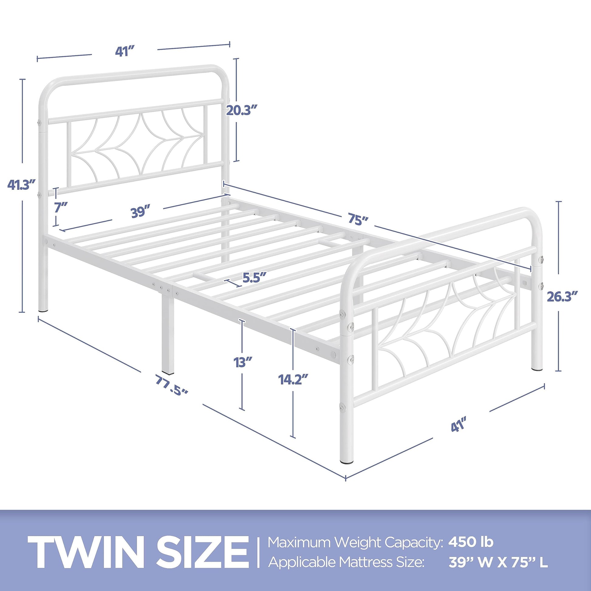 - Dependable Support This bed frame twin size is crafted from heavy duty powder-coated metal construction with 12 robust slats and 6 support legs, with a high load capacity up to 450lb, offering sufficient firmness and stability free of wobbling worry.