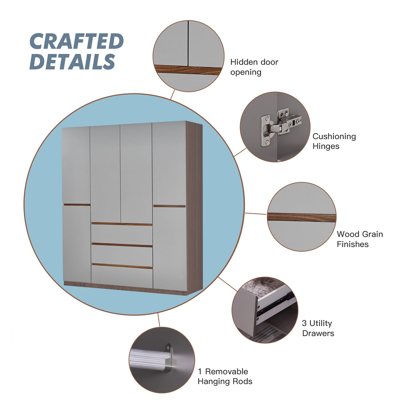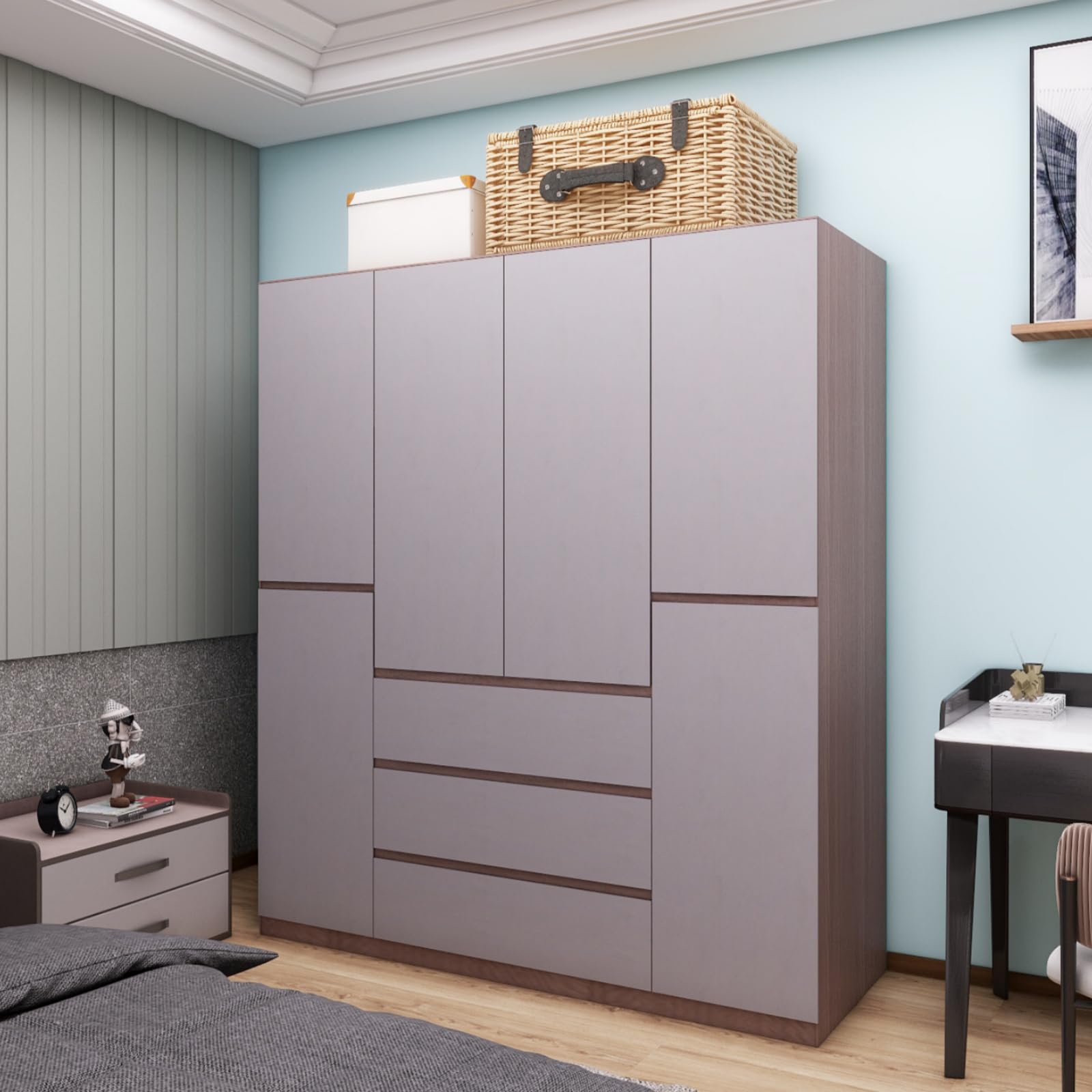 4-Door Armoire Wardrobe Closet, Wooden 3 Drawers Gray Closet Armoire Dresser