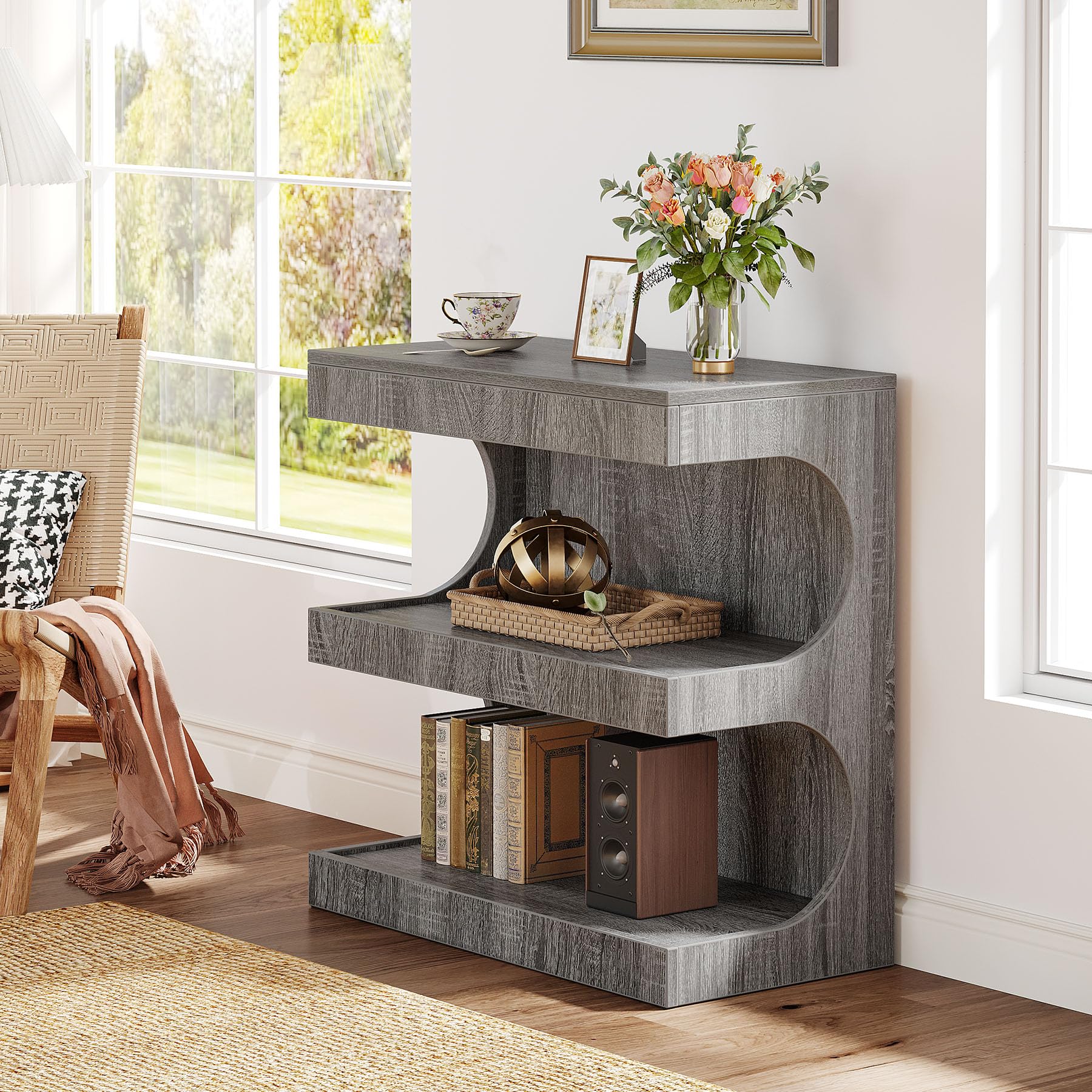 End Table, Narrow Side Table with 3 Storage Shelves, 23.6-Inch Wood Bed Side Table