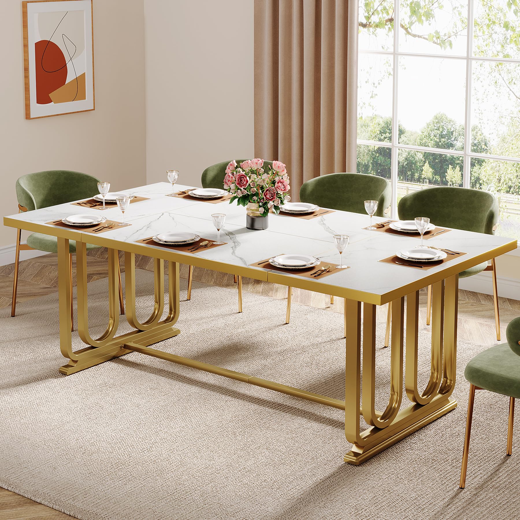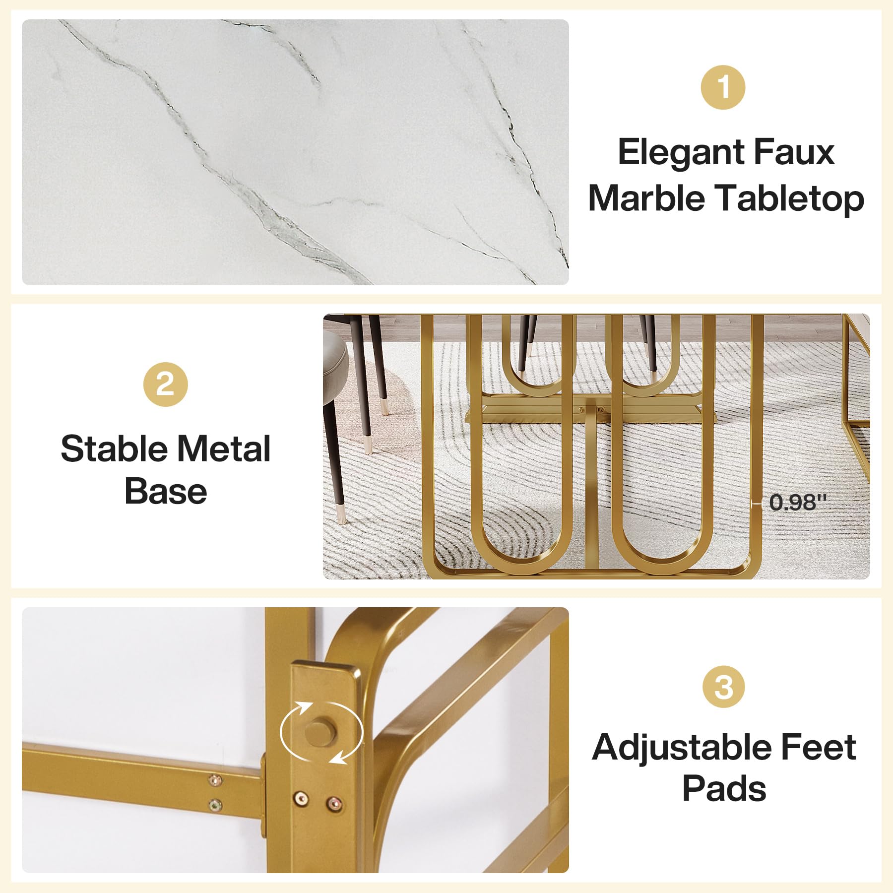 - This modern dining table, featuring a faux marble tabletop and golden legs, boasts a luxurious and elegant design. Its radiant white color and striking appearance are sure to captivate your guests' attention and leave a lasting impression.