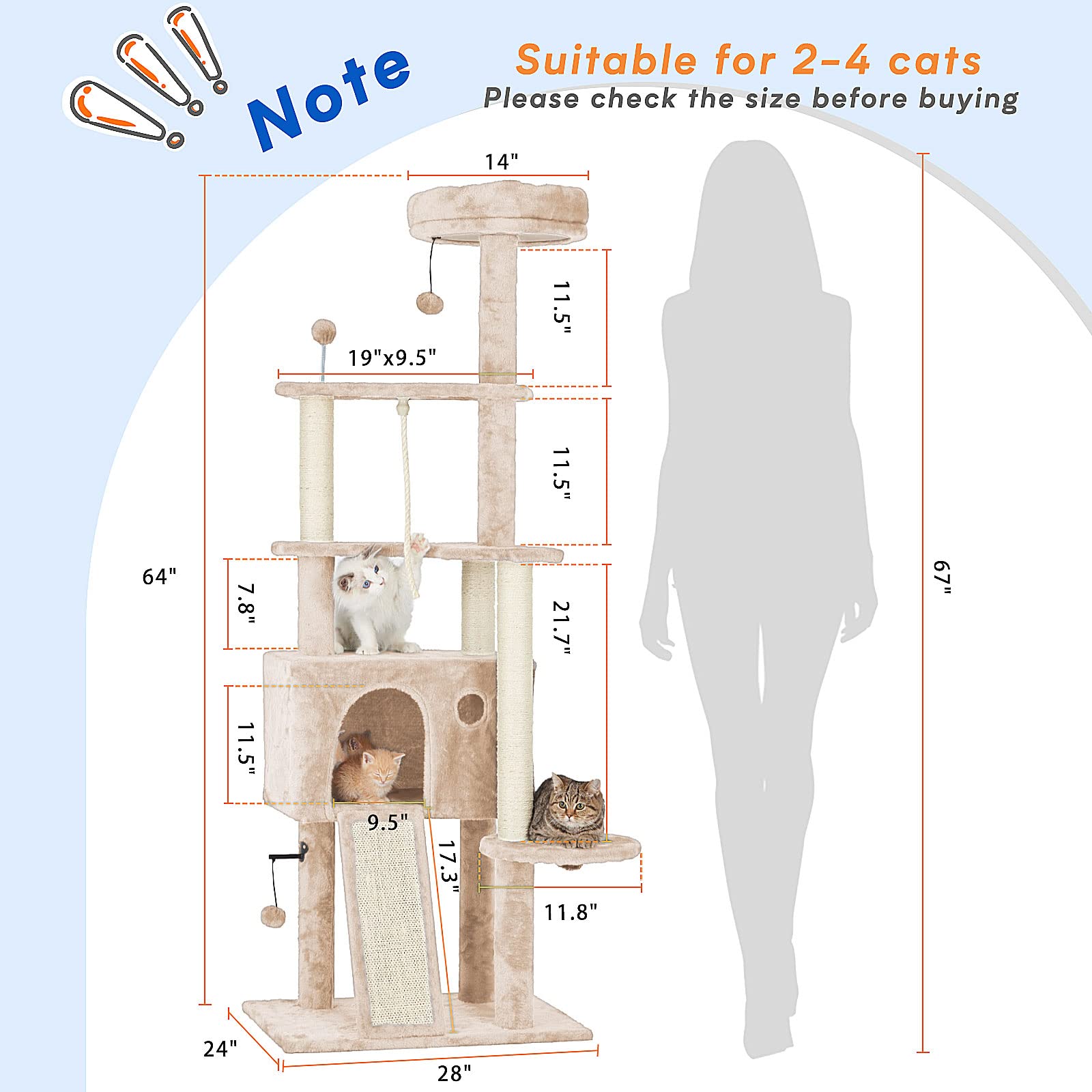 - Large Versatile Fun Center: Dimension: 28"L * 24"W * 64"H. Cats can easily and safely climb up or down this cat tree. Cat tower is safe and stable, avoid tipping and wobbling, provides reliability and stability.