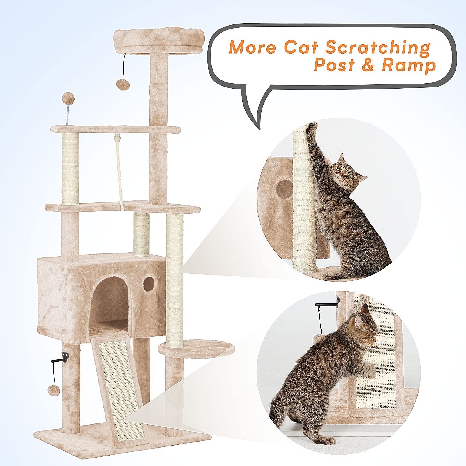- Protect your's furniture: Multi-level meet your feline’s climbing nature. The cat tree has a scratching ramp at the bottom which can be used either as a ladder or as a cat scratching toy. The hanging ball toy and spring soft ball can help stretch the cat, exercise muscles and develop balance control and feline agility.while saving your delicate furniture from scratches.
