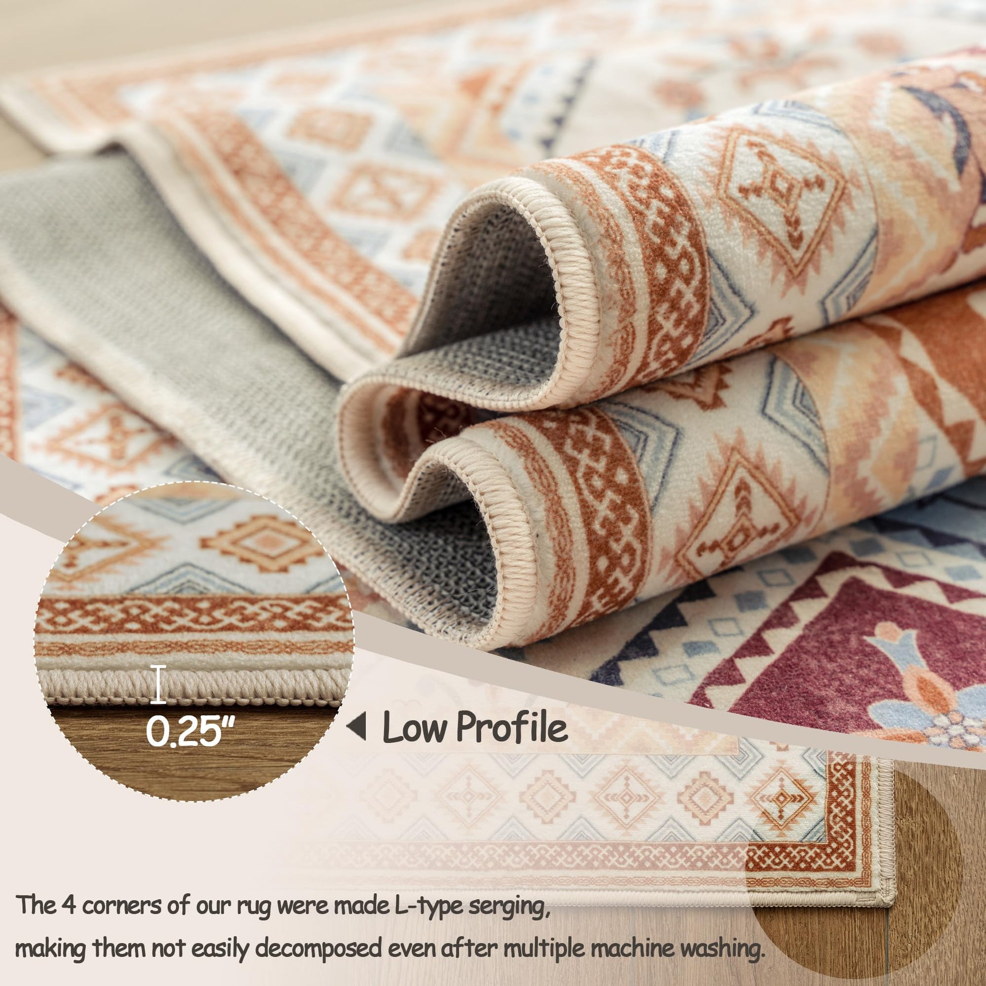 - Machine Washable Area Rug: TTelephant 5x7 washable living room rugs are machine washable. Simply toss living room rugs 5x7 into the washing machine to restore its brand-new look. Note: use cold water (avoid bleach), and either hang dry or tumble dry on low heat. Thanks to its durable reinforced lock edge, this washable farmhouse rug remains resilient and is not easily decomposed even after machine washing.