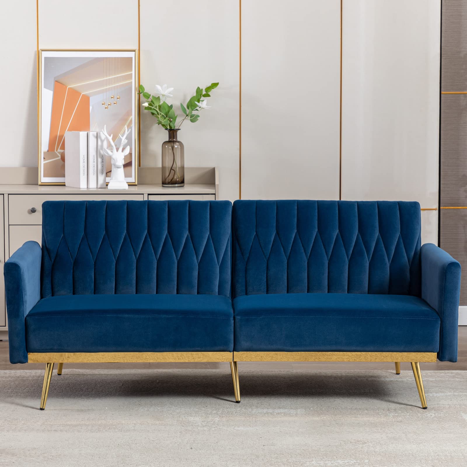 70" Blue Velvet Convertible Futon Sofa Bed, Mid Century Modern Decor, Tufted Loveseat