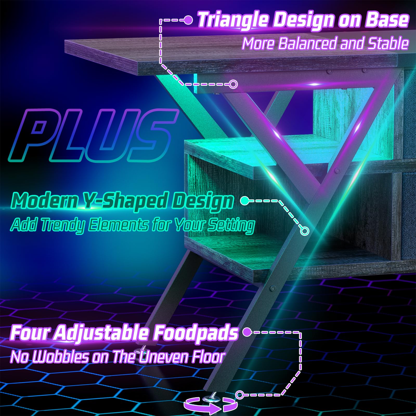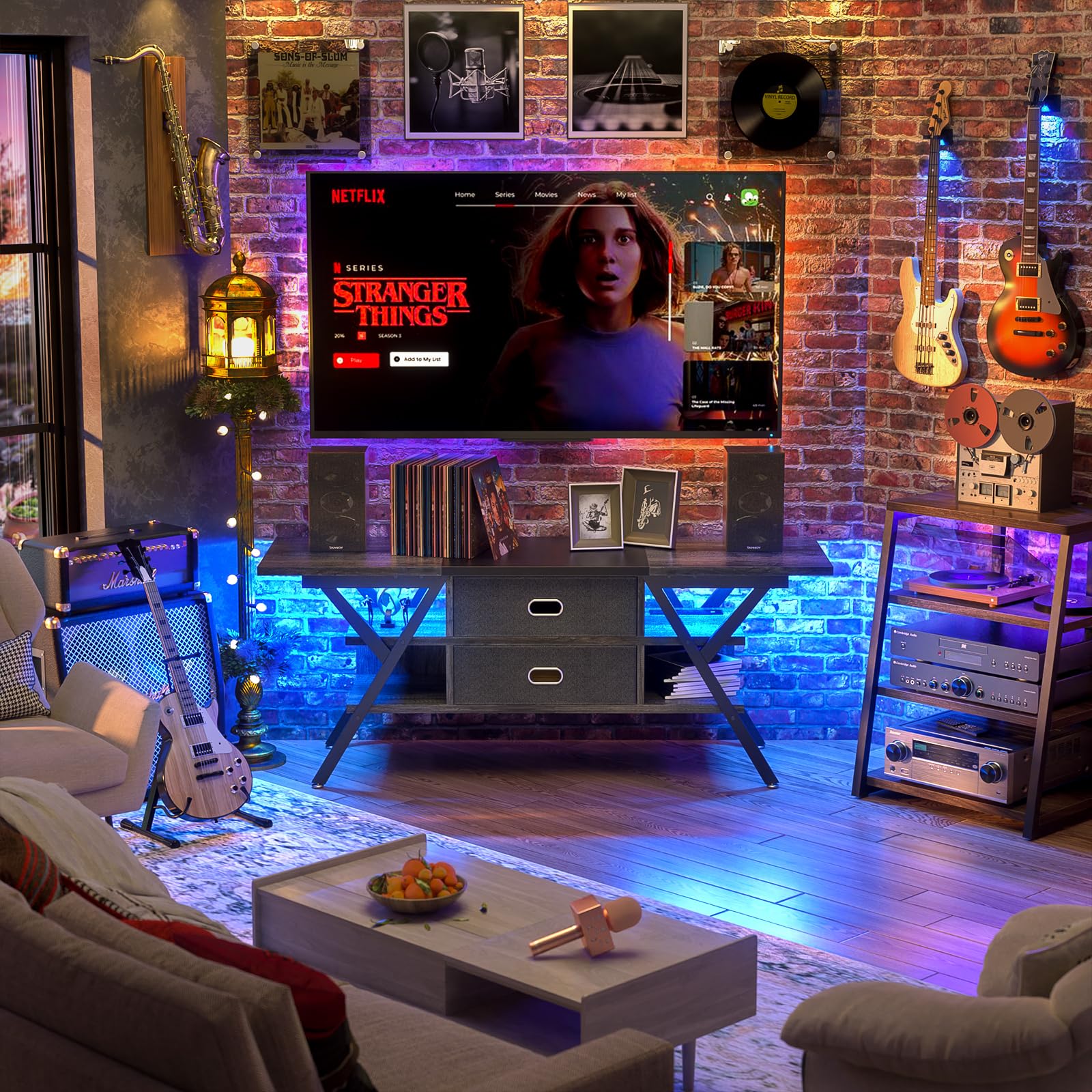 - LED TV Stand - The lighting is good for mood setting. The remote and APP control allow you to change the color of the lights that shine onto the second shelf of this television stand. Static mode and 20 dynamic modes are flexible options for your gaming and movie vibes. By getting the coolness of RGB LED lights, your leisure space will be more attractive.