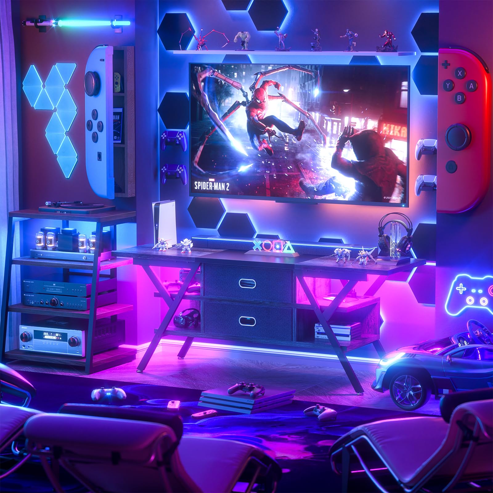 - Tons of Room - This TV console has a lot of room, plenty for movies, action figures, and game consoles. There's storage for board games and game disks. The entertainment center with storage can accommodate a PS4/PS5, a soundbar, an HDMI switch, and some miscellaneous items. Two included drawers are great for controller storage and whatnot.